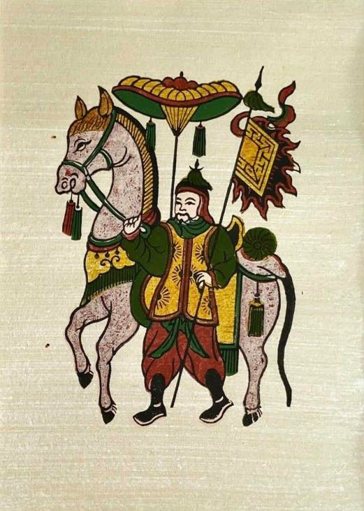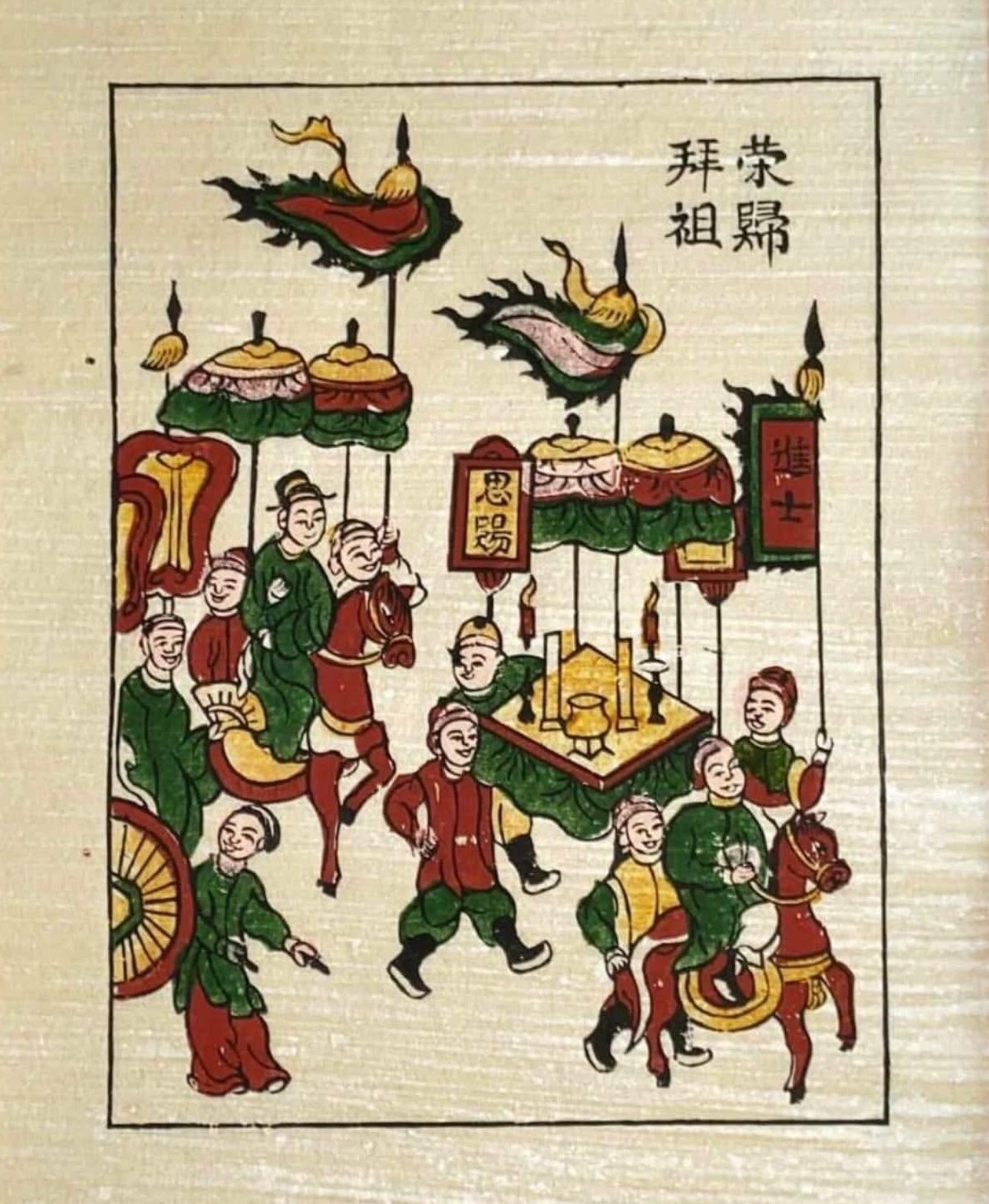 Bức “Vinh quy bái tổ” – Tranh dân gian Đông Hồ. Hình ảnh ngựa, lọng, cờ quạt trong tranh khắc họa cảnh người đỗ đạt vinh quy trở về làng, biểu trưng cho công danh thành tựu.