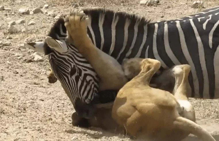 Trong khoảnh khắc hỗn loạn, con sư tử đã kịp tóm được một con ngựa vằn trưởng thành, ngoạm chặt vào cổ với hy vọng hạ gục con mồi trong tích tắc. Tuy nhiên, trái ngược với dự tính, ngựa vằn không hề khuất phục. Nó dùng toàn bộ sức mạnh vùng vẫy, thậm chí còn đè ngược sư tử xuống đất, khiến cuộc đi săn đảo chiều.