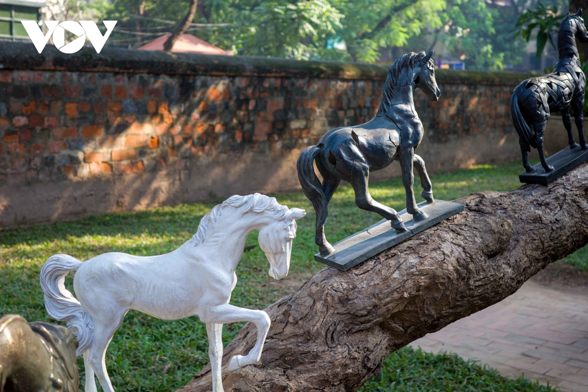 Sự kết hợp giữa ánh sáng và chất liệu giúp các tác phẩm về ngựa trở nên nổi bật, tạo chiều sâu thị giác trong không gian cổ kính của Văn Miếu.