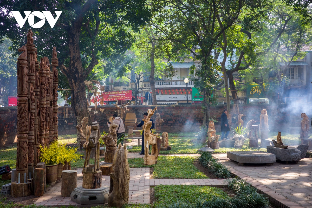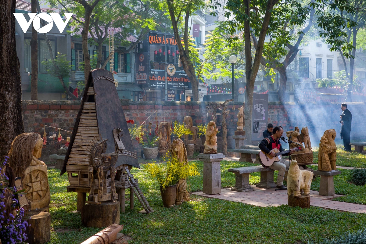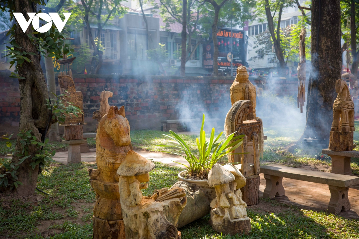 Một tác phẩm sắp đặt được đặt giữa sân Văn Miếu, tạo nên sự giao thoa trực tiếp giữa nghệ thuật đương đại và không gian kiến trúc cổ kính.