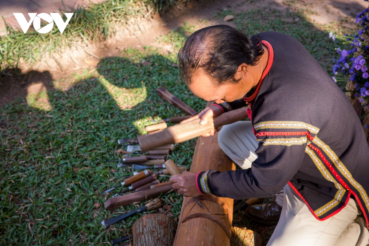 Nghệ nhân Y Bhiông Buôn Yă thể hiện hoa văn cổ xuất hiện trên thổ cẩm vào gỗ.