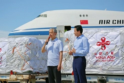 Đại sứ Trung Quốc tại Campuchia Uông Văn Bân (bên trái) cùng chuyến hàng viện trợ đến Phnom Penh vào ngày 28/12. (Nguồn: Facebook)