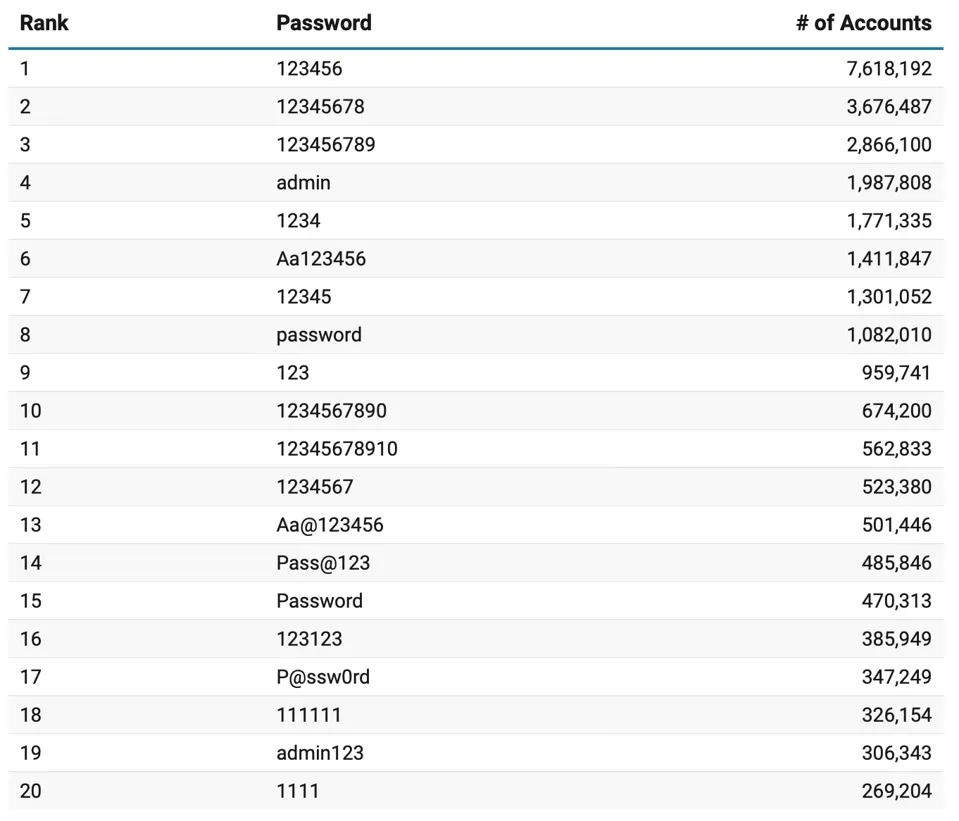 Danh sách 20 mật khẩu yếu nhất trong năm 2025. Ảnh: Comparitech