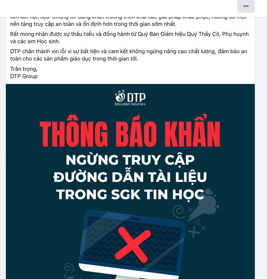 Trưa 9-4, Tập đoàn giáo dục Đại Trường Phát (DTP Group) - đơn vị phát hành sách điện tử nói trên, đã thông báo khẩn trên fanpage chính thức về việc ngừng truy cập các liên kết học liệu điện tử trong sách "Tin học lớp 3".