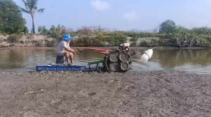 Theo ông Biện Thanh Lâm, ý tưởng gắn phao nổi xuất phát từ thực tế vuông tôm luôn có nước. Khi tăng độ nổi, máy không bị chìm, người vận hành cũng an toàn hơn.