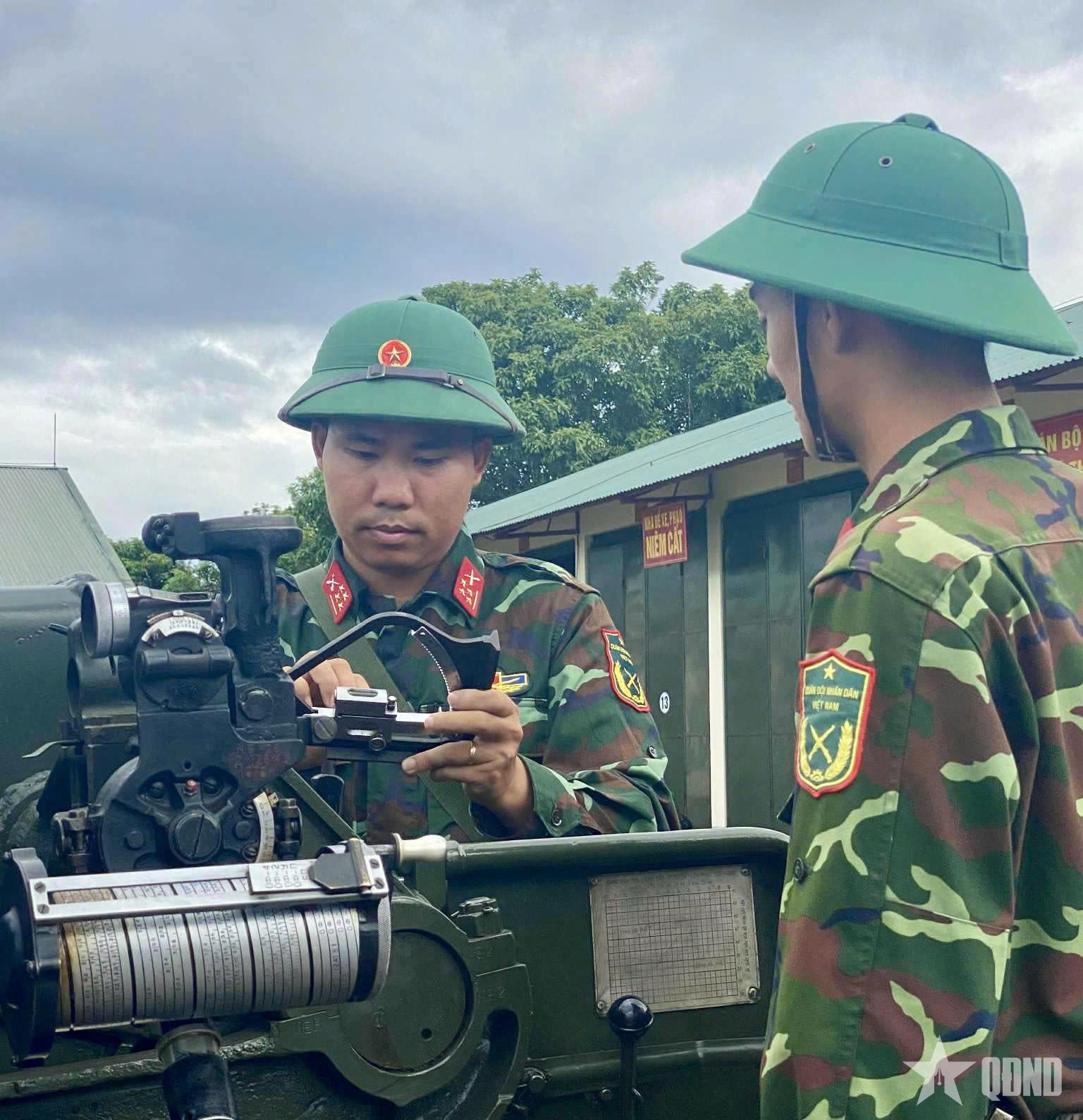 Đại úy Chu Văn Đông hướng dẫn bộ đội kiểm tra hiệu chỉnh thước bắn trên pháo.