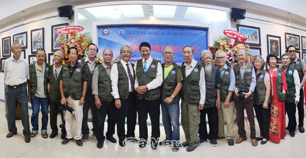 NSNA Đoàn Hoài Trung, Chủ tịch Hội Nhiếp ảnh TP Hồ Chí Minh (thứ 8 từ trái sang), chụp ảnh lưu niệm với các thành viên CLB Nhiếp ảnh Người cao tuổi TP Hồ Chí Minh.
