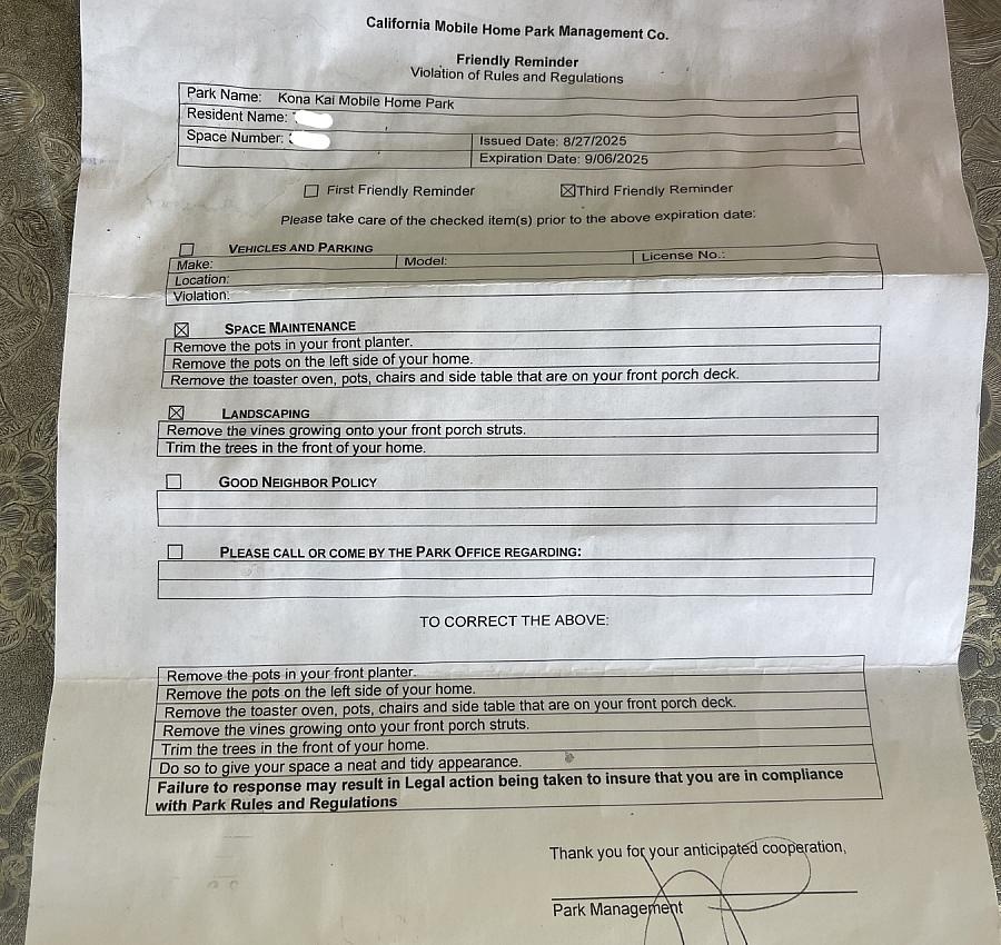 Bà Tran và người chồng 91 tuổi đã sở hữu căn mobile home (mô hình nhà nhà lắp ghép phổ biến tại Mỹ) tại Kona Kai Mobile Home Park suốt 7 năm. Ngôi nhà từng là chốn bình yên và gắn kết cộng đồng. Nhưng nhiều tháng gần đây, họ liên tục bị nhắc nhở phải tuân thủ một loạt yêu cầu ngày càng khắt khe từ ban quản lý, theo Center for Health Journalism.