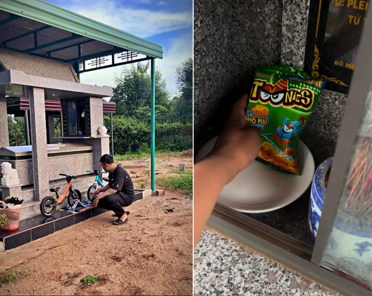 Anh cũng thường xuyên mang quà bánh, đồ chơi đến mộ cho con