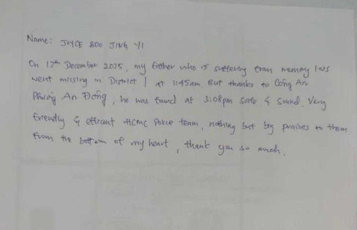 Bức thư tạm dịch như sau: "Vào ngày 12/12/2025, cha tôi (bị lẫn) đã mất tích tại quận 1 (cũ) lúc 1h45 sáng. Đến 15h8, Công an phường An Đông đã tìm thấy ông ấy ở trạng thái an toàn. Thật sự mà nói Công an TP.HCM rất thân thiện, làm việc hiệu quả. Tôi chỉ biết gửi lời khen ngợi và cảm ơn sâu sắc từ tận đáy lòng. Xin chân thành cảm ơn".