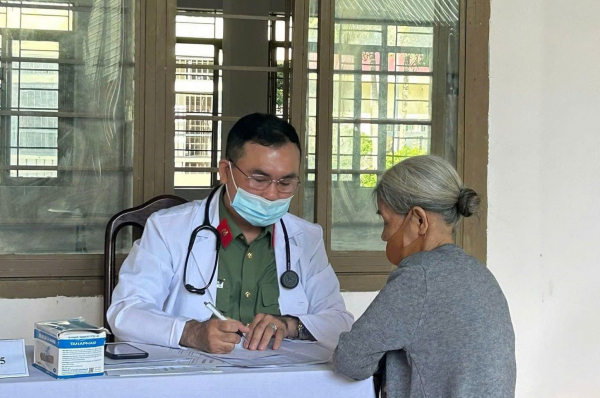 Thiếu tá, bác sĩ Hồ Xuân Hòa cùng đồng đội tham gia khám bệnh, tư vấn sức khỏe cho người dân có hoàn cảnh khó khăn.