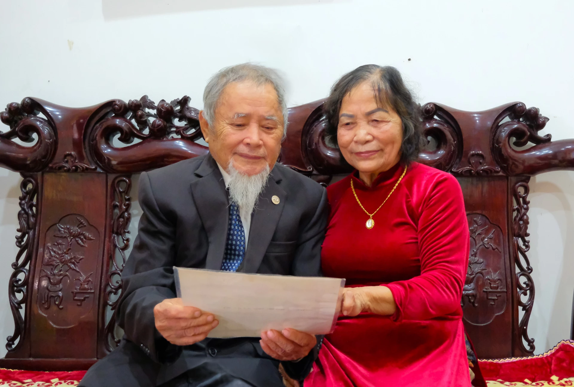 Ông Thỉ và vợ ôn lại kỷ niệm về Hợp tác xã Măng non Duy Viên - Ảnh: Trần Tuyền