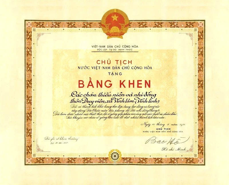 Bằng khen của Chủ tịch Hồ Chí Minh tặng tập thể thiếu niên, nhi đồng thôn Duy Viên - Ảnh: NVCC