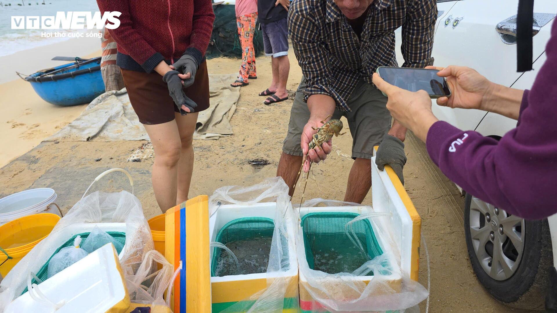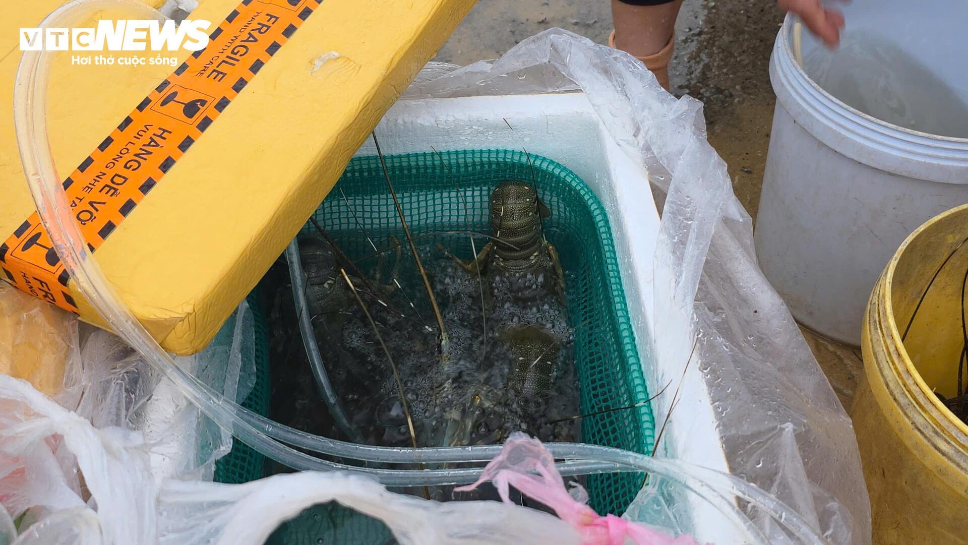 Người dân đưa tôm hùm giống lẫn tôm hùm thịt vào các xô hoặc thùng xốp có sục khí oxy để vận chuyển lên xe chở vào vịnh Vũng Rô (xã Hòa Xuân, Đắk Lắk) hoặc đầm Môn (Khánh Hòa) để tiếp tục ươm nuôi, tránh bão.