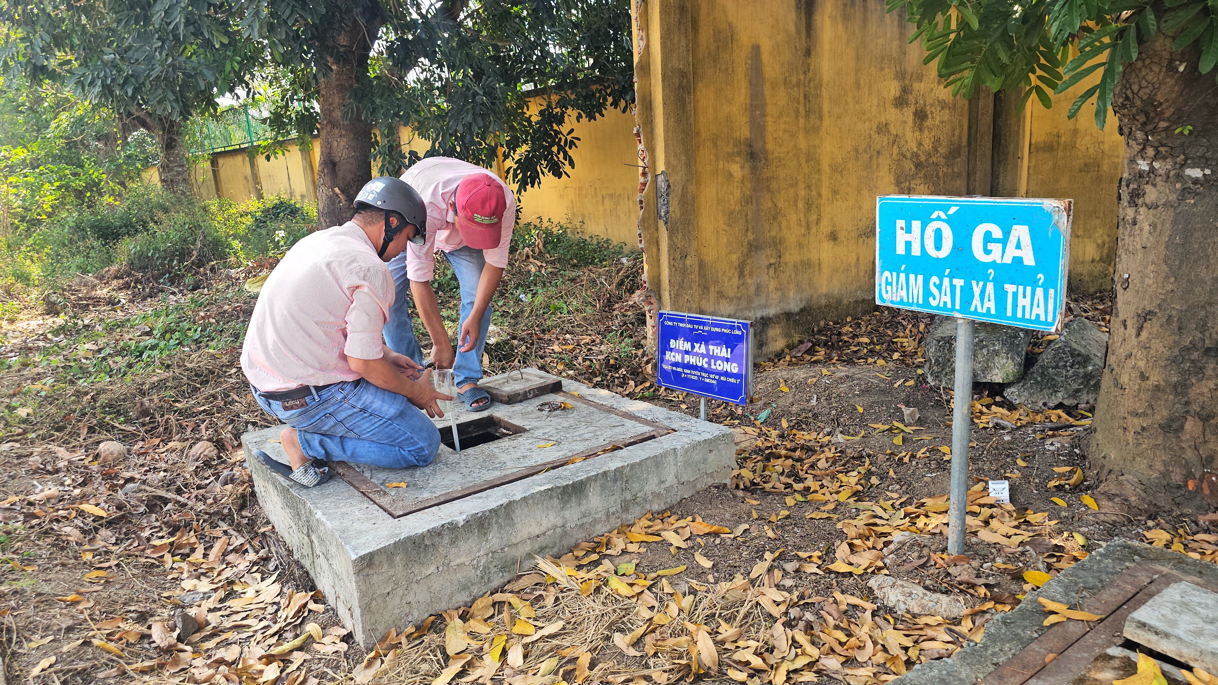 Nhân viên KCN Phúc Long kiểm tra độ pH tại các hố ga xả thải ra ngoài môi trường. Ảnh: HD