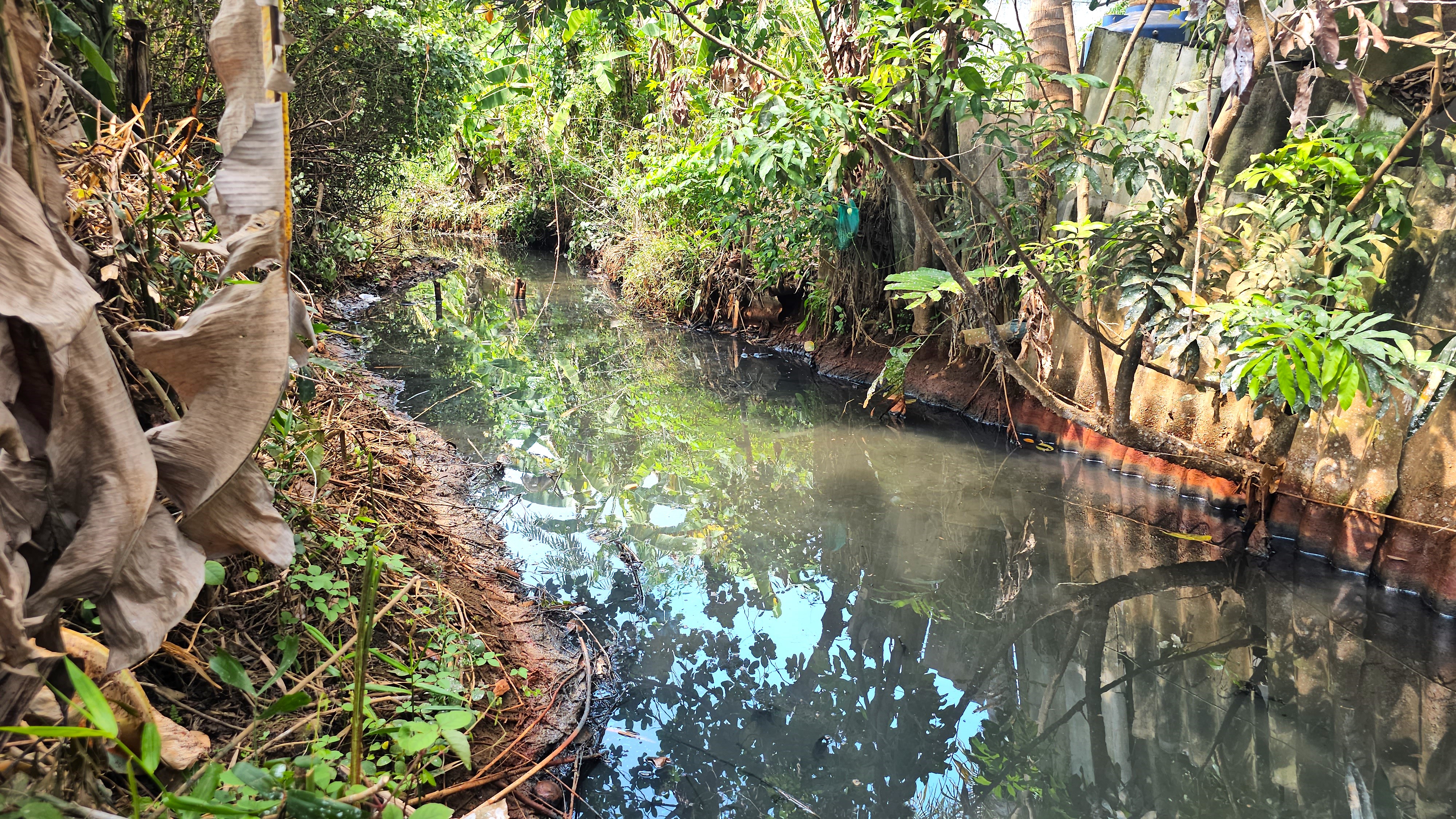 Dòng nước từ trong KCN chảy ra kênh nội đồng đã hết ô nhiễm, nước không còn màu vàng. Ảnh: HUỲNH DU