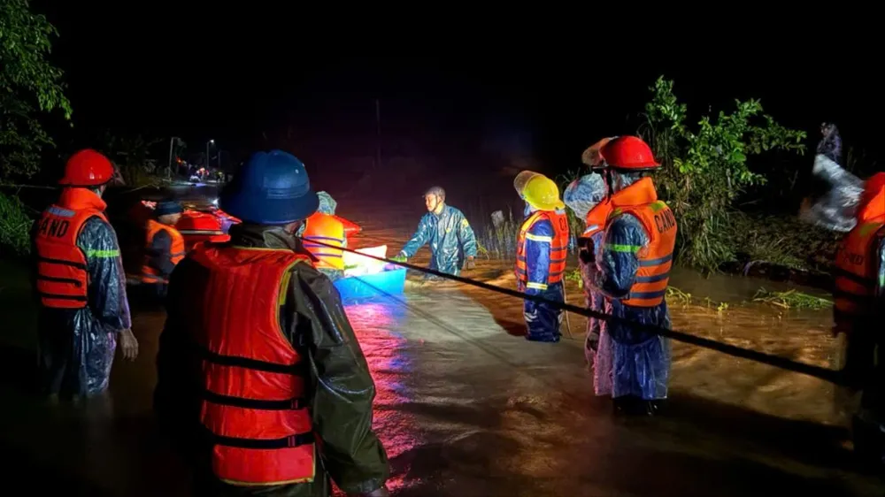 Lực lượng chức năng hỗ trợ người dân vượt lũ, sơ tán trong đêm.