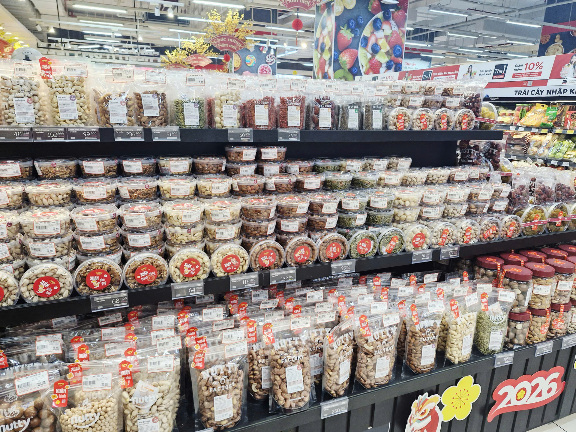 Danh mục hàng hóa Tết tập trung vào các ngành hàng chủ lực như bánh kẹo, đồ uống và các mặt hàng thiết yếu phục vụ bữa ăn gia đình. Trong đó, nhóm bánh kẹo và đồ uống được xác định là trọng tâm, ưu tiên các thương hiệu uy tín, sản phẩm chất lượng cao, mẫu mã Tết đa dạng, đáp ứng nhu cầu biếu tặng cũng như tiêu dùng trong gia đình. Nhóm hàng khô và hàng thiết yếu như gạo, dầu ăn được chuẩn bị đảm bảo nguồn cung xuyên suốt mùa cao điểm Tết. Riêng gạo, sản lượng chuẩn bị tăng 20%.