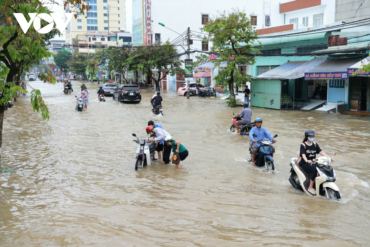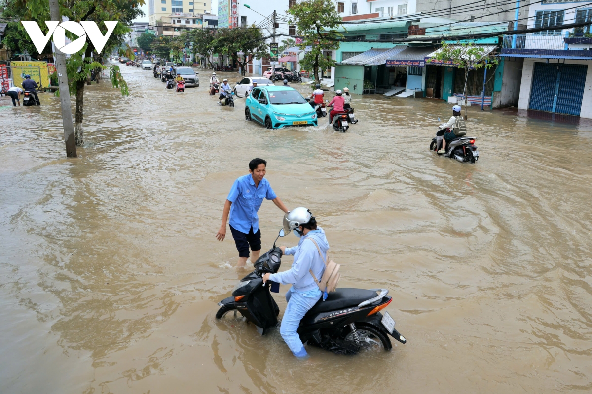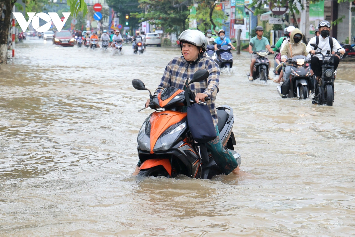 Tại những khu vực trũng đã ngập ở những đợt triều cường trước nay càng ngập sâu hơn gây khó khăn cho người và phương tiện lưu thông.