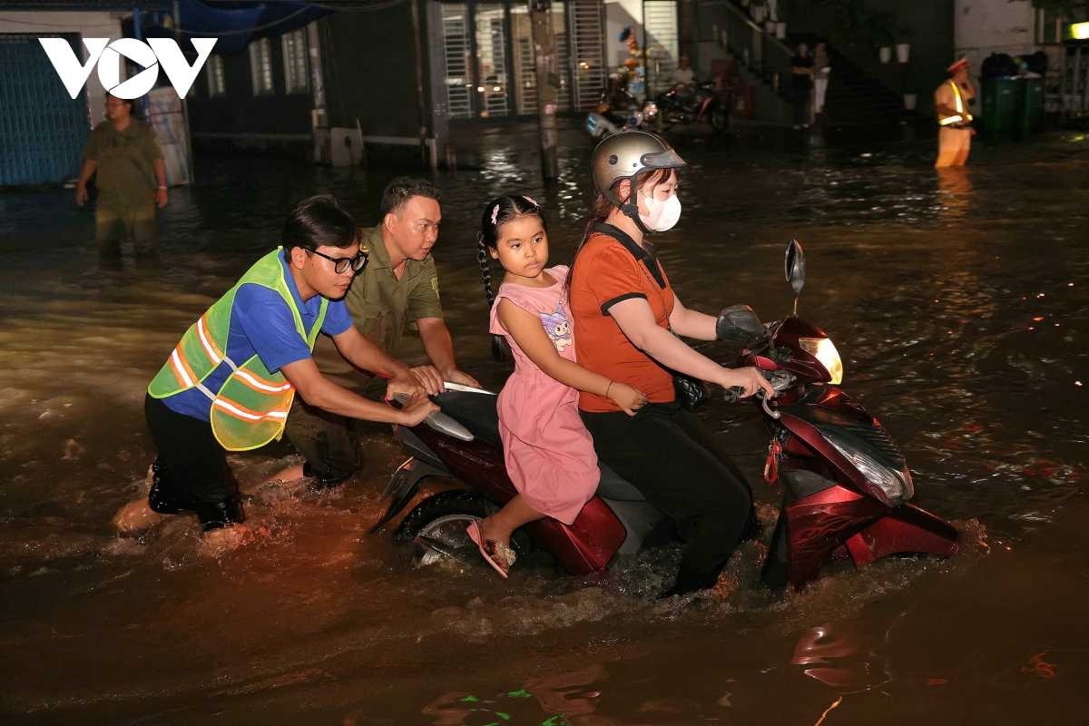 Các lực lượng phối hợp hỗ trợ người dân qua những đoạn đường bị triều cường gây ngập sâu trong chiều tối 6/11