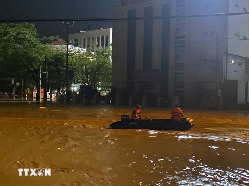 Trong đêm, lực lượng cứu hộ, cứu nạn vẫn tích cực hoạt động vì sự an toàn cho người dân. (Ảnh: Quốc Đạt/TTXVN)
