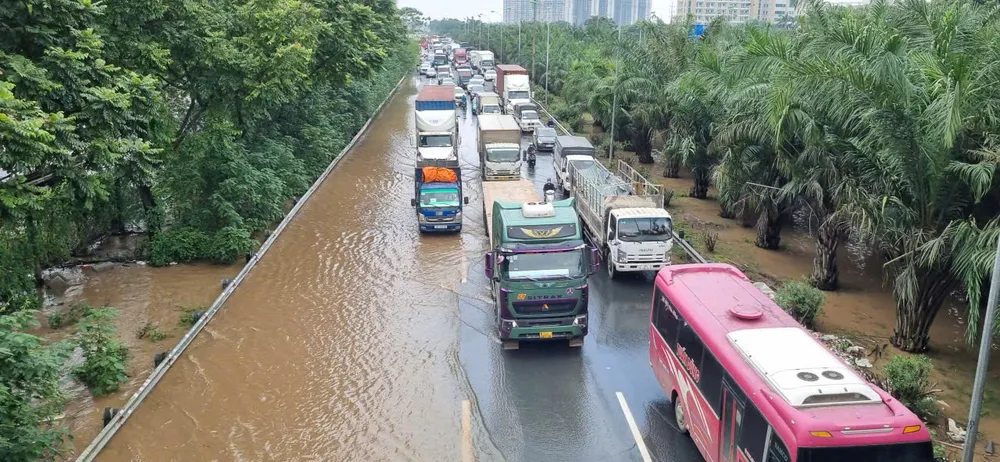 Nước ngập khiến giao thông trên tuyến Đại lộ Thăng Long bị ùn tắc. Ảnh: V.LONG