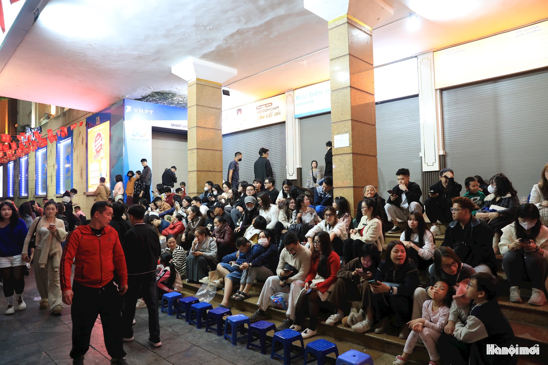 Nhiều người ngồi giữ chỗ trước cửa Bưu điện Hà Nội chờ xem pháo hoa.