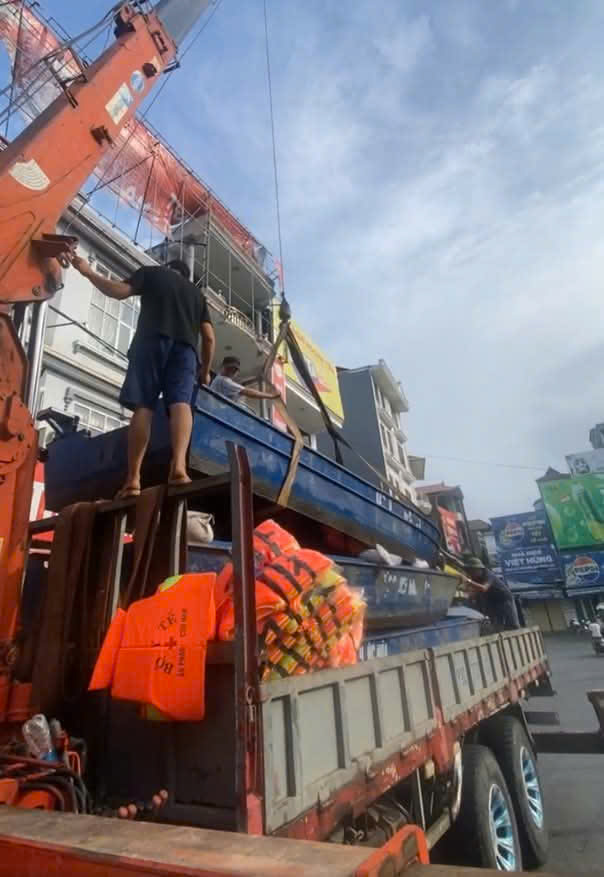 Người dân xã Hương Sơn, TP Hà Nội cẩu thuyền từ bến Đục lên bờ, đưa lên xe vận chuyển tới Thái Nguyên để hỗ trợ người dân vùng lũ