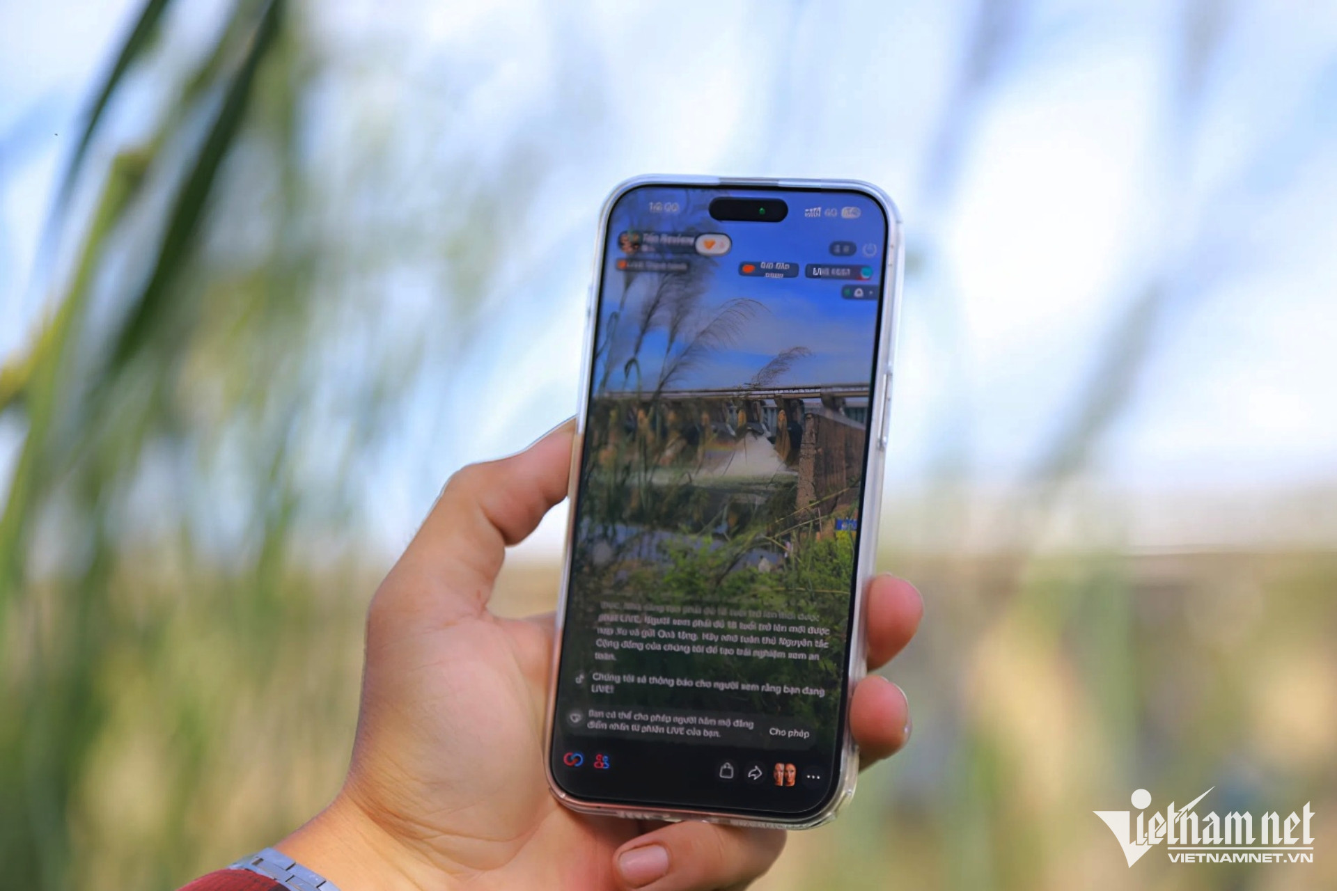 Đúng 14h, cửa xả đập tràn được mở, người dân đồng loạt hướng mắt về phía dòng nước. Nhiều người dùng điện thoại livestream, chụp ảnh ghi lại khoảnh khắc nước trắng xóa đổ xuống hạ du.