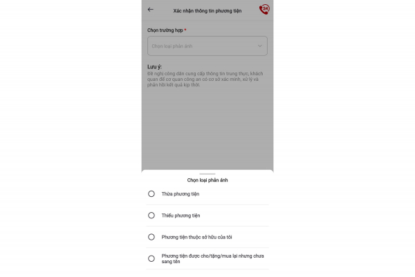 Chọn trường hợp, loại phản ánh: Với xe mà mình không đứng tên, chọn báo thừa; Với xe mà mình có đứng tên nhưng chưa có trong hệ thống, chọn báo thiếu; Với xe đã bán, cho, tặng nhưng chưa sang tên, thu hồi biển số, chọn xe thuộc sở hữu của tôi; Với xe đã mua, được cho, tặng nhưng chưa làm thủ tục sang tên mình, chọn phương tiện được cho, tặng nhưng chưa sang tên.