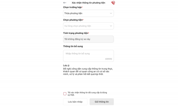 Chọn và kiểm tra các thông tin đúng ở mục tình trạng phương tiện rồi chọn "Xác nhận". Sau khi hoàn thành, màn hình điện thoại sẽ hiện kết quả tiếp nhận từ cơ quan chức năng.