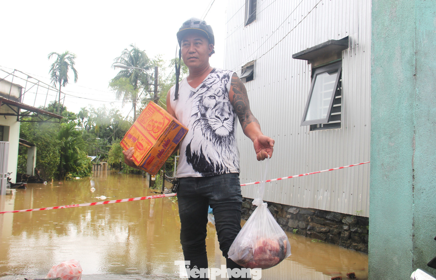 Anh Ngô Tấn Minh (phường Hòa Xuân) đi làm về mua theo mì tôm, cá thịt nhưng chờ cả sáng vẫn không thể mang đồ vào trong. Cuối cùng anh phải chèo tạm chiếc thúng của hàng xóm để đưa thức ăn cho cả nhà.