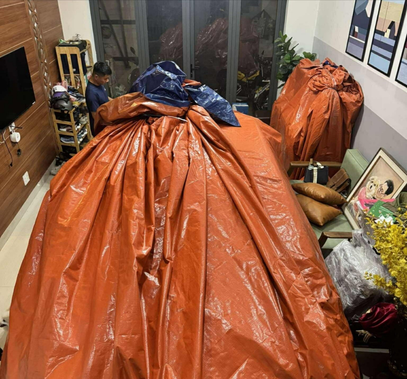 Ngoài xe ô tô, anh còn dùng bạt bọc kín cây đàn piano đề phòng nước lũ. Phía ngoài cửa còn làm thêm vách chống ngập cao 1,4m. Anh chia sẻ thêm, đợt ngập lịch sử vào tháng 10/2022, nhà anh bị ngập 1m, hư hại rất nhiều đồ đạc. Xe ô tô cũng bị nhấn chìm nên giờ nghe dự báo mưa lớn là rùng mình.