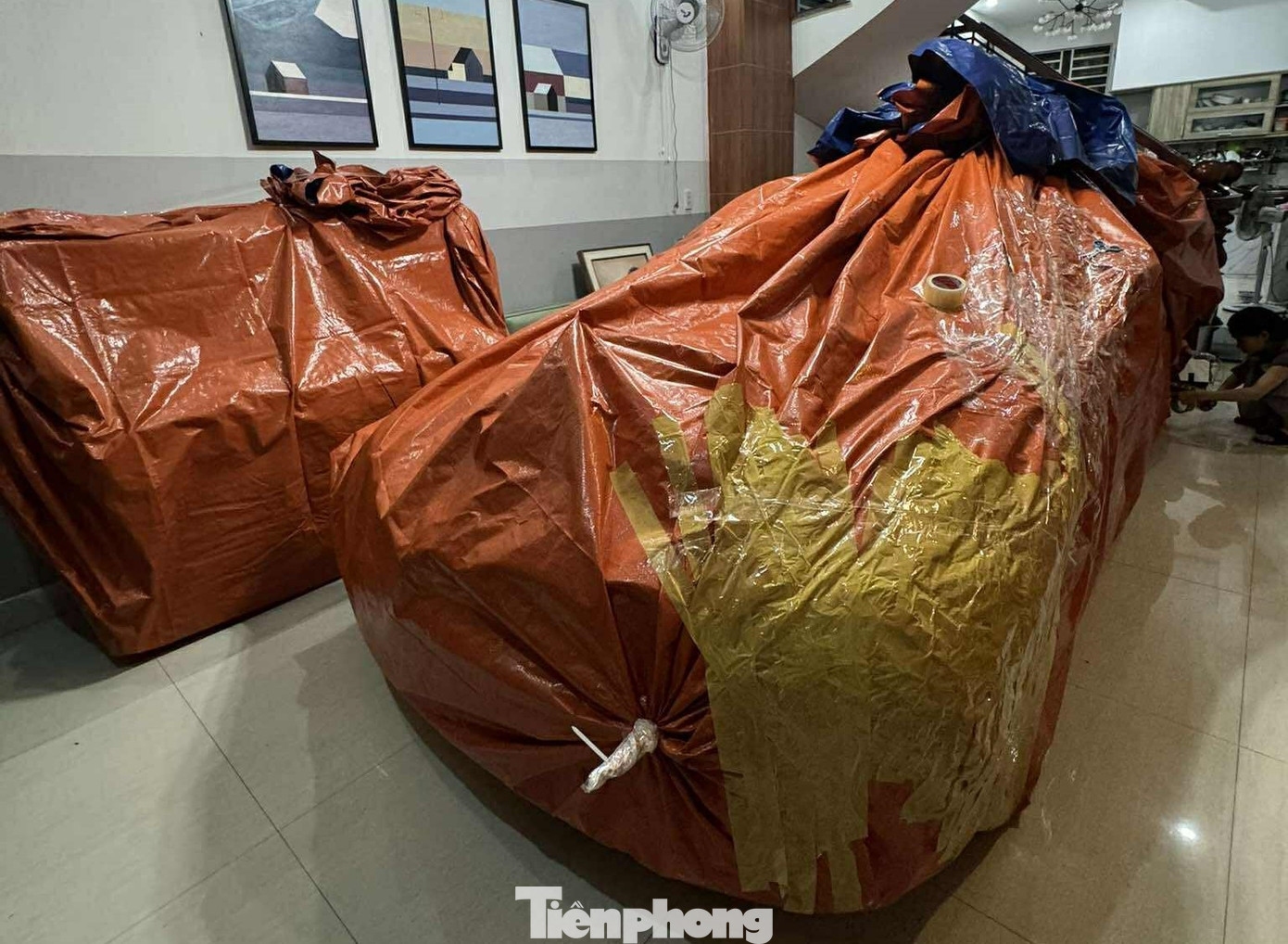 Xe ô tô được trùm bạt kín, để trong nhà phòng ngập nước.
