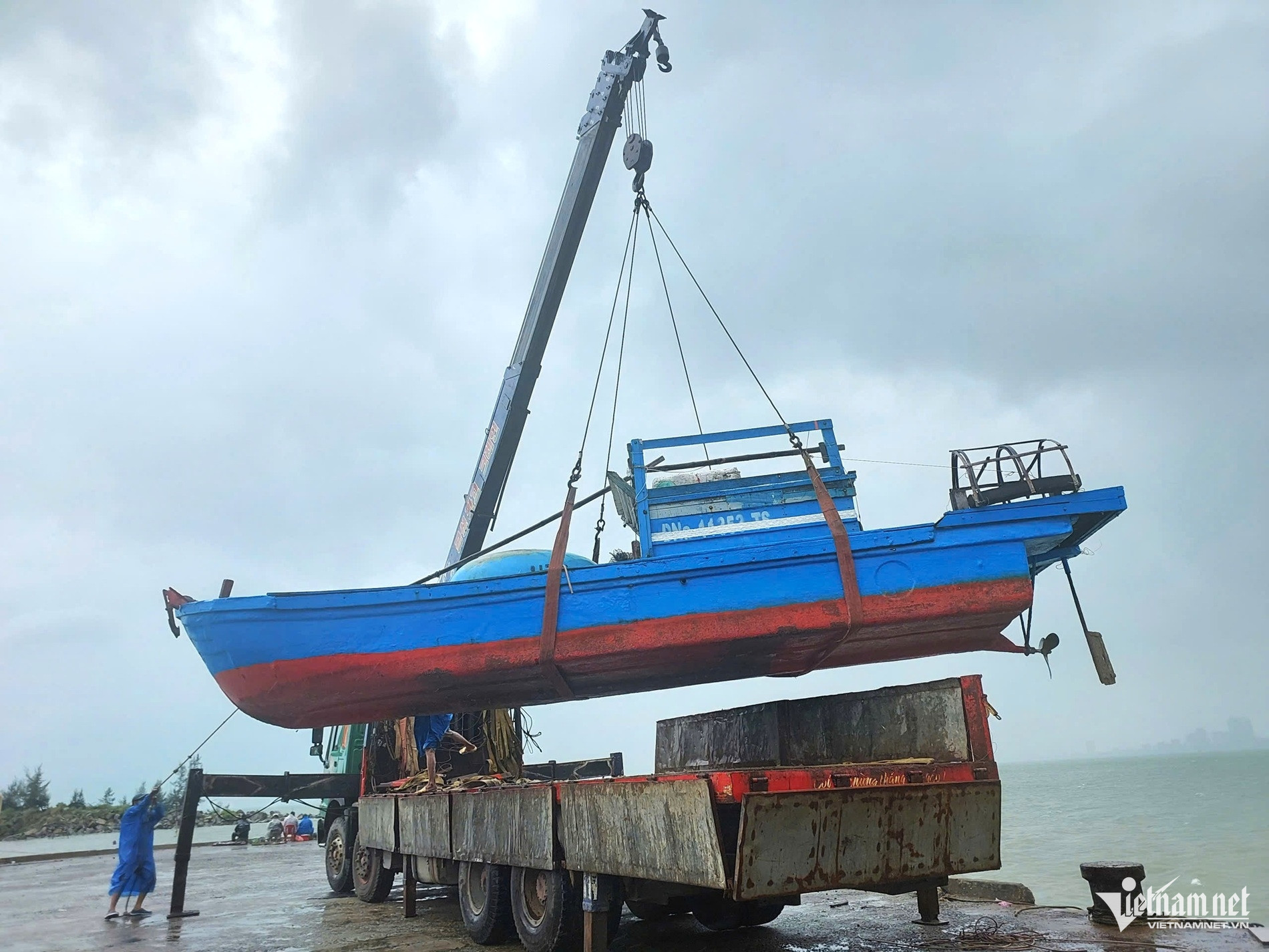 Người dân Đà Nẵng thuê xe cẩu đưa tàu thuyền lên bờ tránh bão.