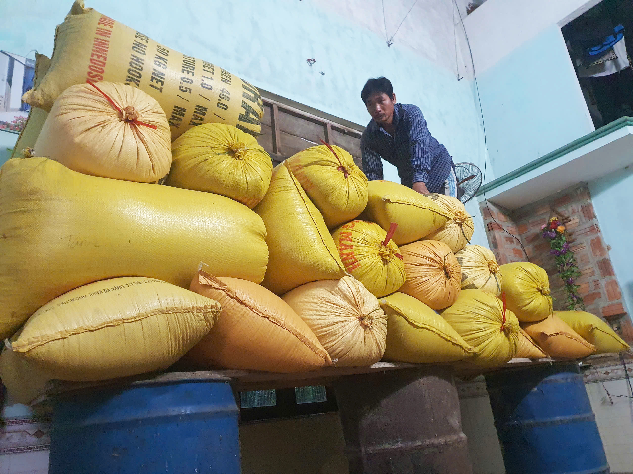 Chiều tối 27/10, ông Tân hối hả mang 5 thùng phi từ trên gác xuống, gác cây làm giá đỡ. Gần 5 tấn lúa vừa thu hoạch, chưa kịp bán, giờ phải kê lên cao để tránh nước.