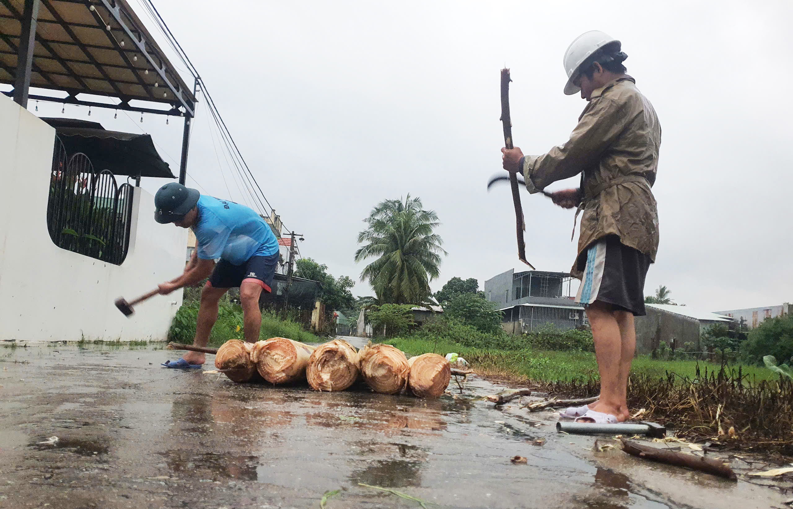 Sau khi dọn đồ đạc, anh Huỳnh Minh Thủy (trú cùng thôn) tranh thủ chặt chuối, đóng bè. Nhiều lần đón lũ, anh biết "phương tiện" bất đắc dĩ này sẽ cần khi nước vây tứ phía.