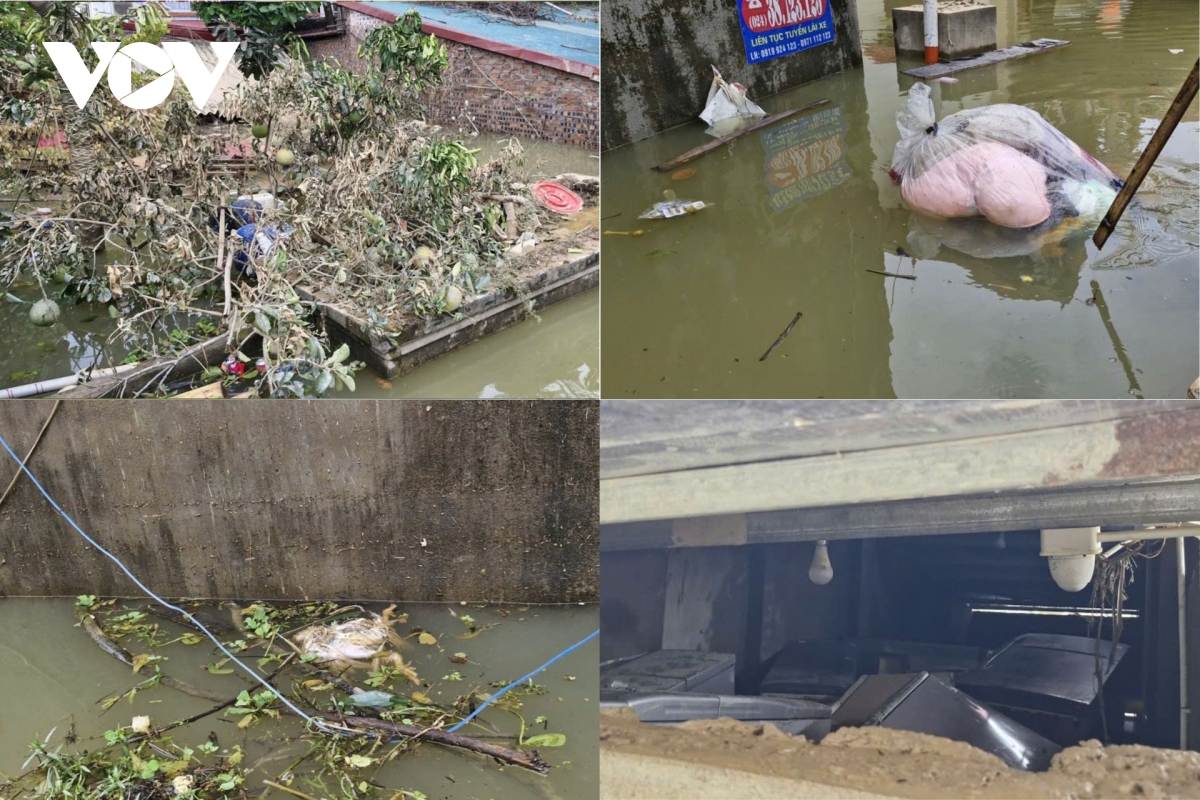 Sau nhiều ngày ngập, ứ đọng, gia súc chết, đồ đạc trôi nổi khắp nơi, khiến môi trường trong khu dân cư ô nhiễm nặng. (Ảnh NVCC)