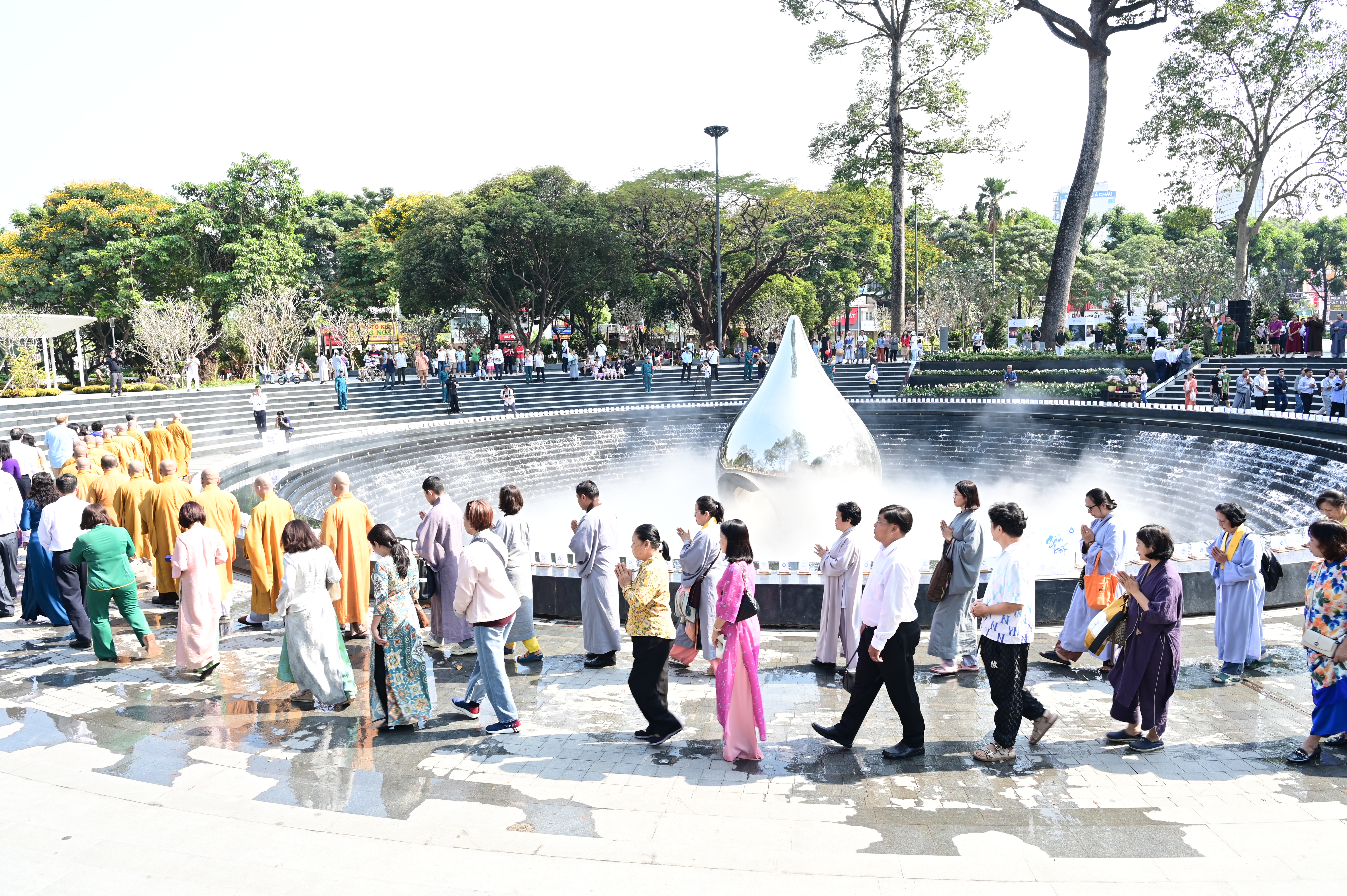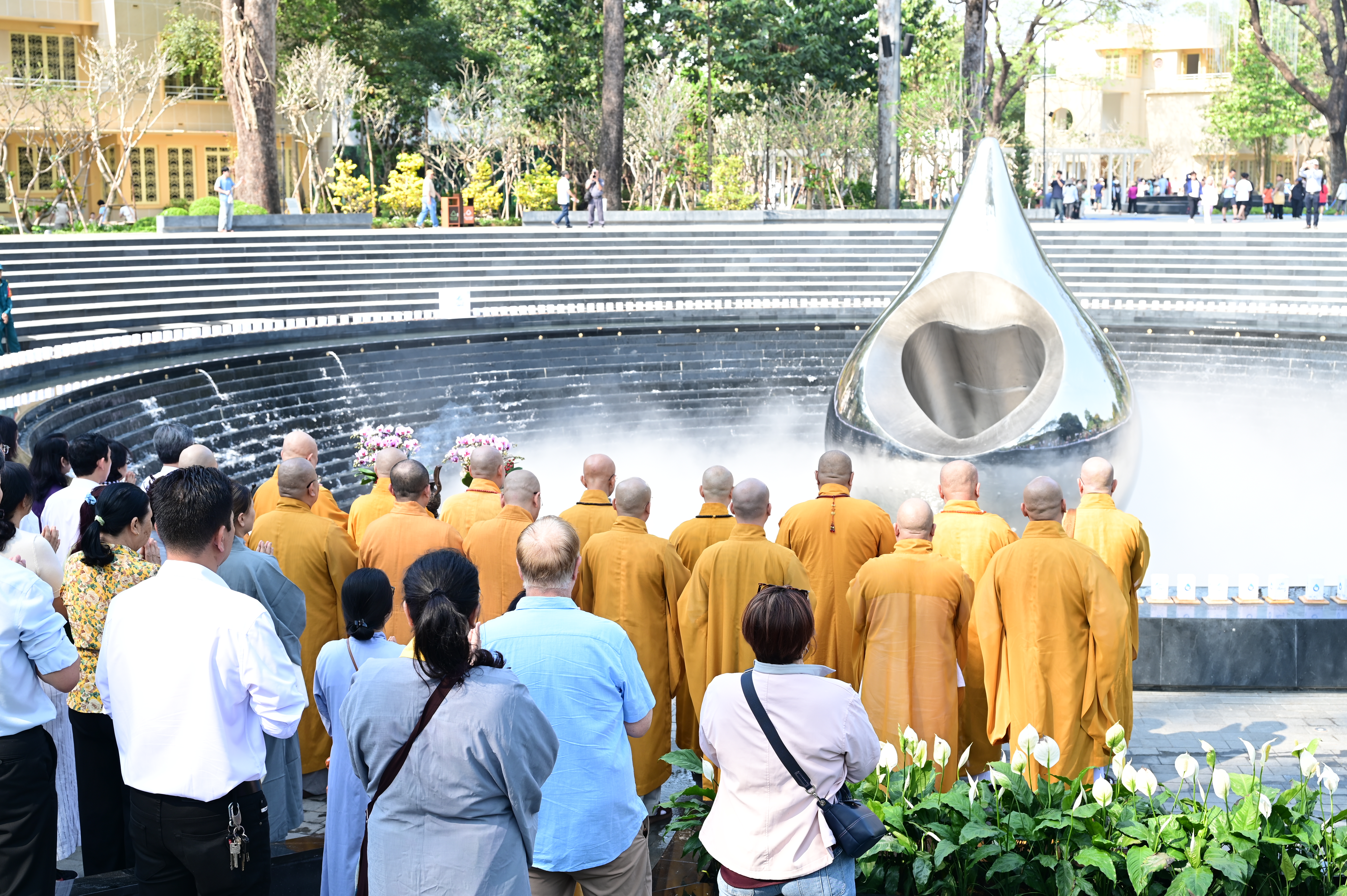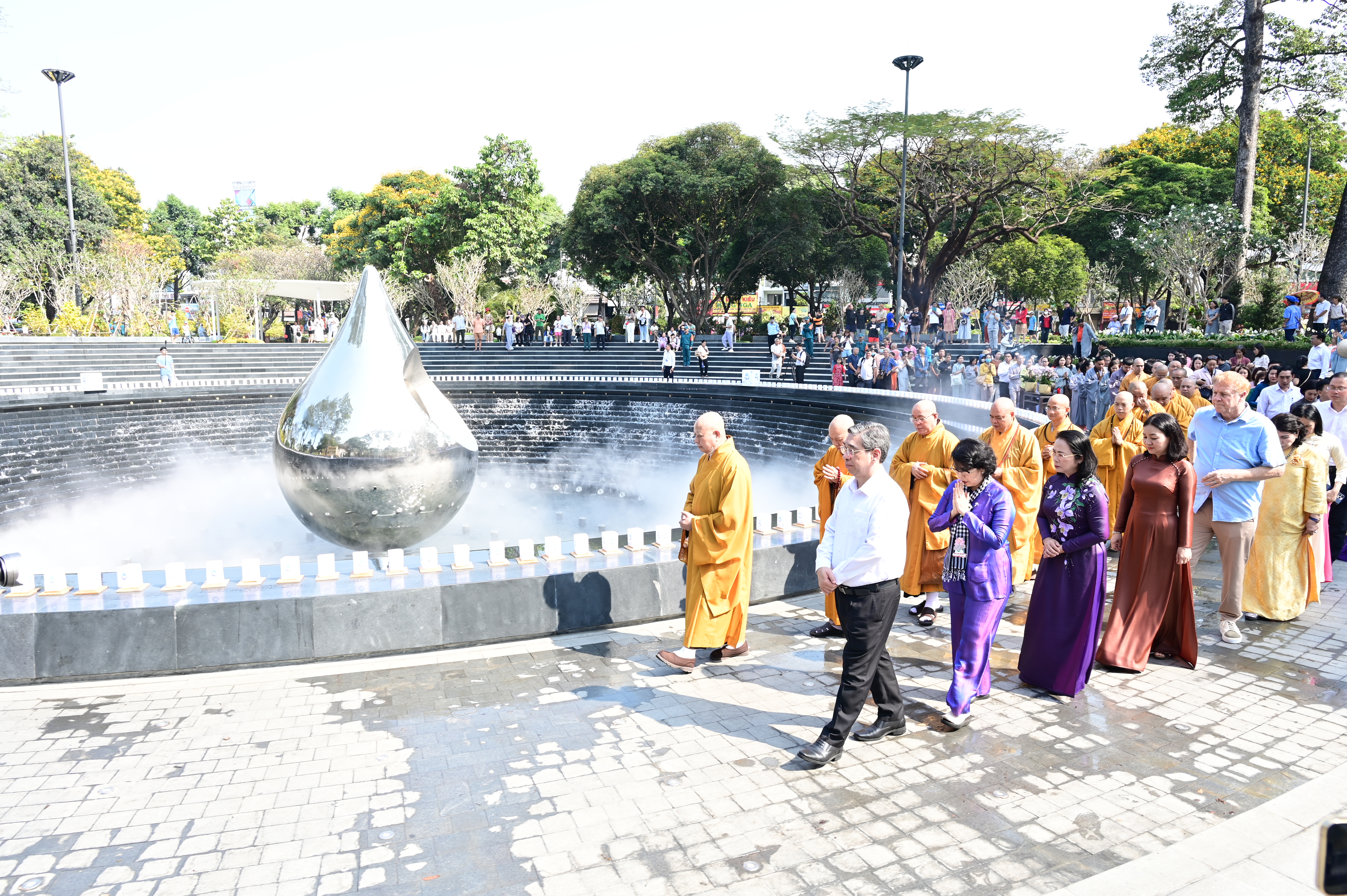 Giữa không gian tĩnh lặng trước tượng đài giọt nước - Công viên số 1 Lý Thái Tổ, đoàn lãnh đạo TPHCM và hàng trăm người dân dành những giây phút lắng đọng, thắp nén hương lòng tưởng nhớ hàng ngàn đồng bào, cán bộ, chiến sĩ hy sinh, qua đời trong đại dịch Covid-19 khốc liệt.