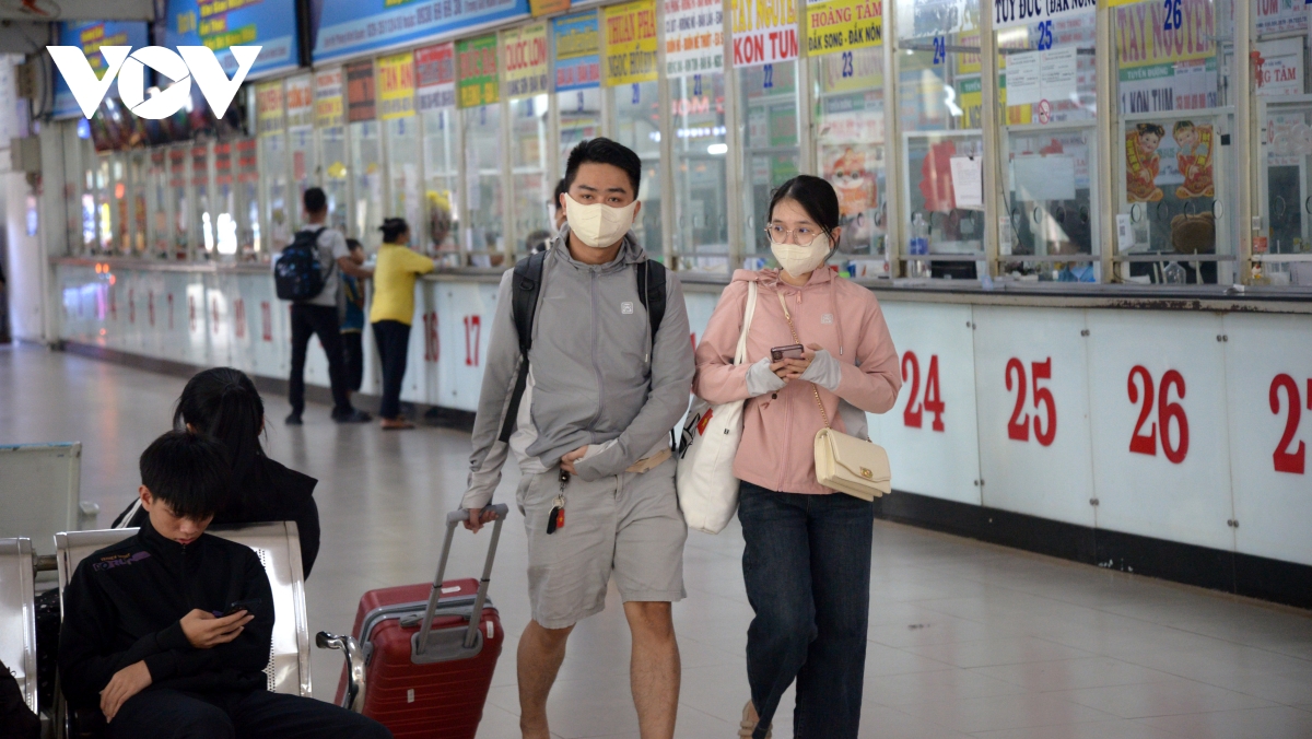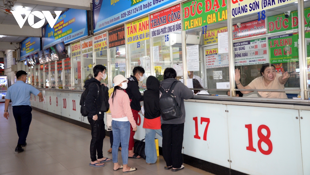 Tại Bến xe miền Đông cũ, càng về cuối ngày, tình hình giao thông càng đông. Dòng xe ra vào bến liên tục, các tuyến đường xung quanh bến như Đinh Bộ Lĩnh, Nguyễn Xí, Quốc lộ 13… khá đông đúc. Trong bến, nhiều người tranh thủ xong giờ làm việc cuối cùng để về quê hoặc đi du lịch. Anh Phạm Hải Đăng đang chuẩn bị đưa 2 người em về quê nghỉ lễ cho biết mua vé khá dễ dàng.