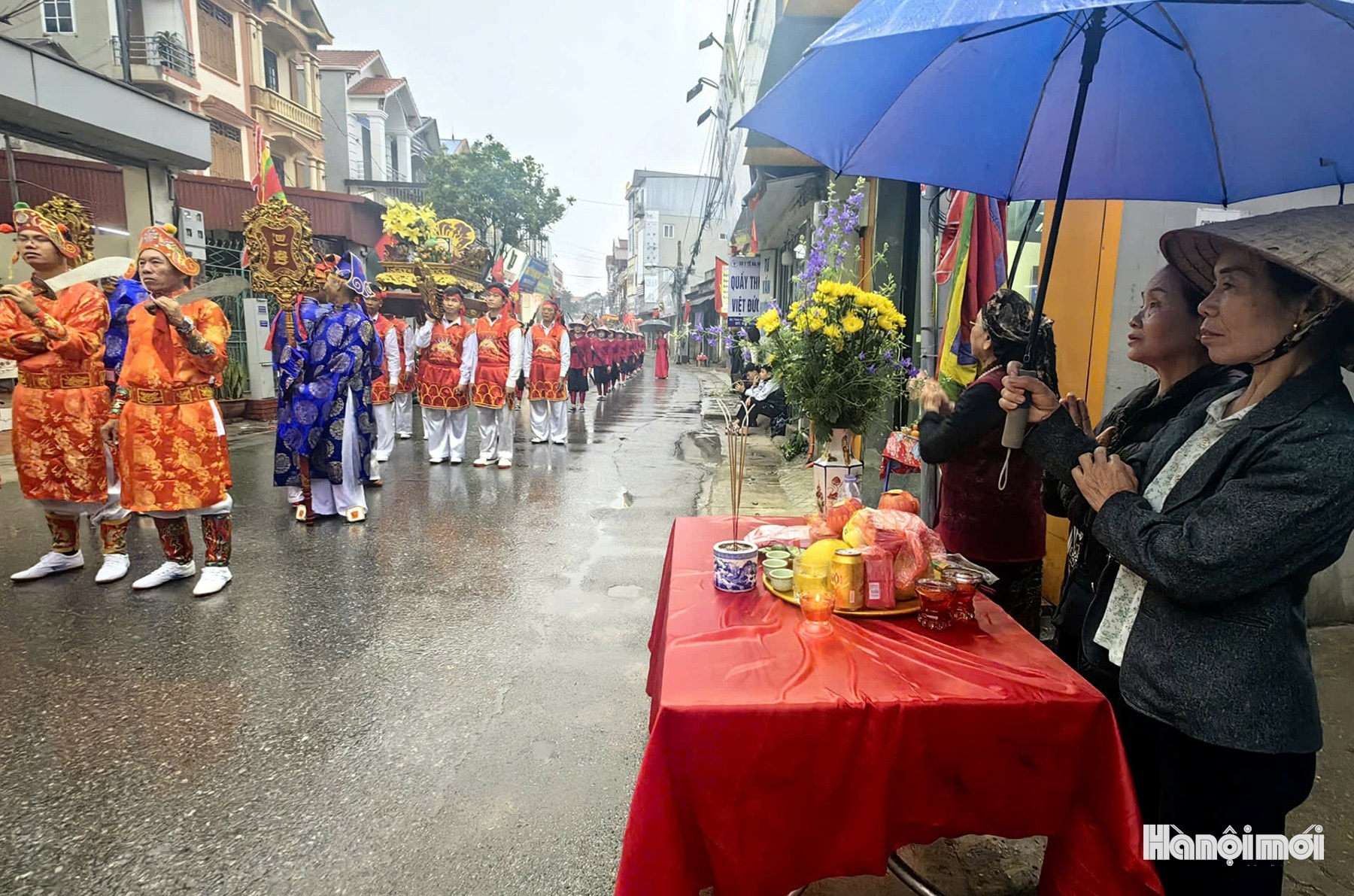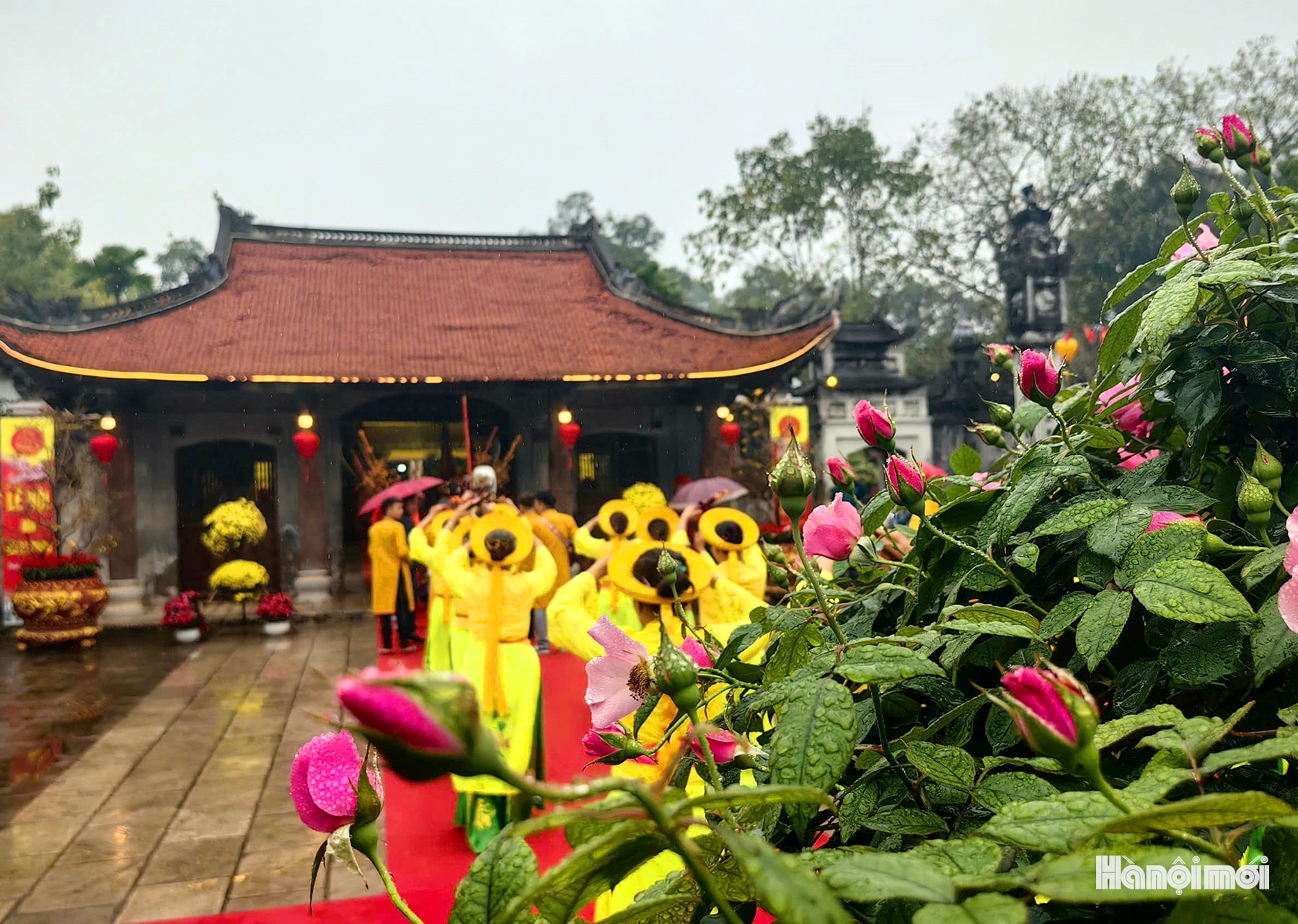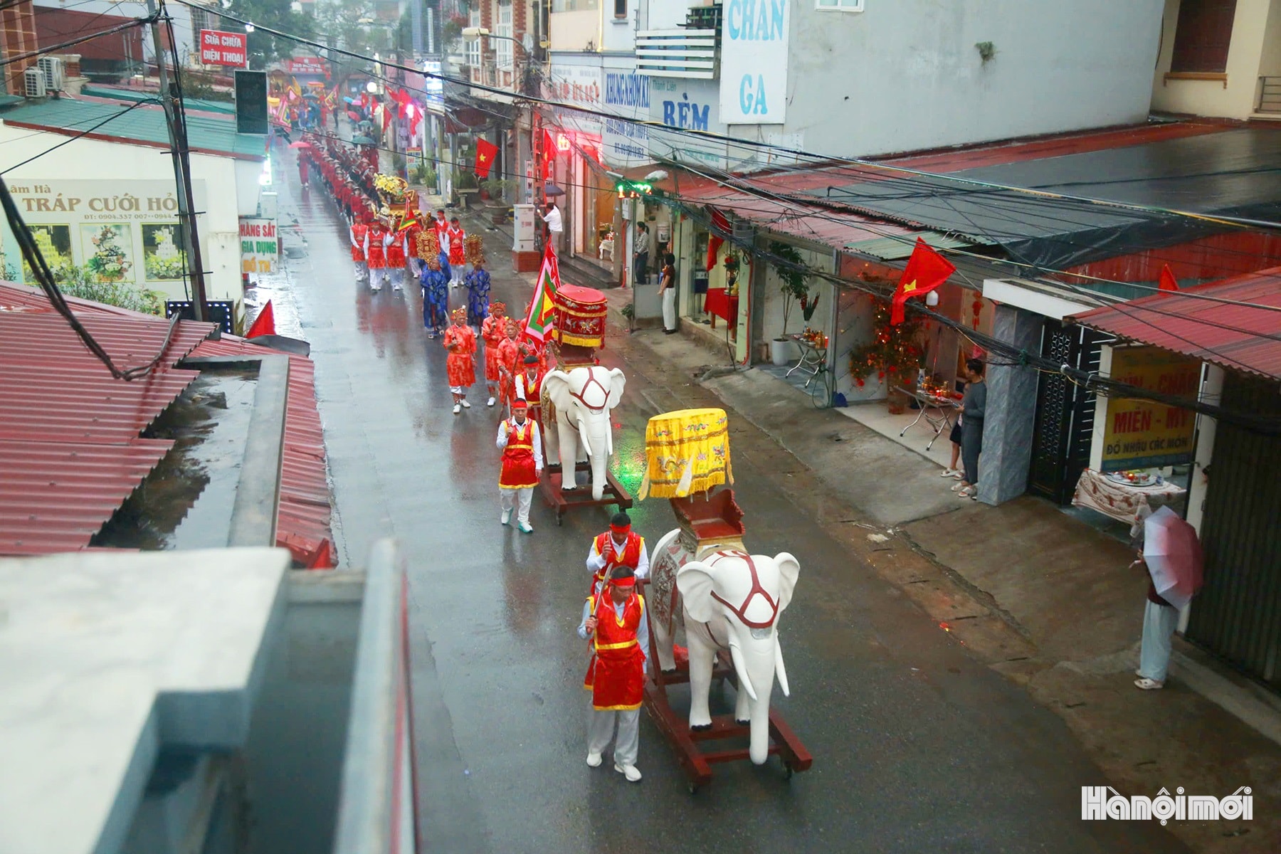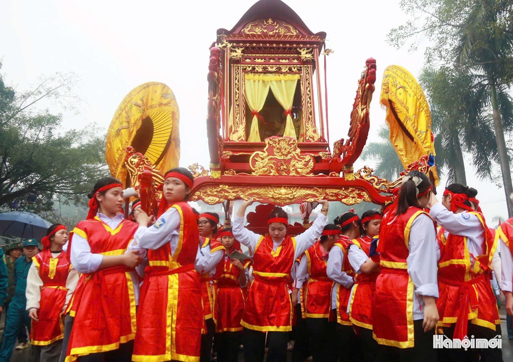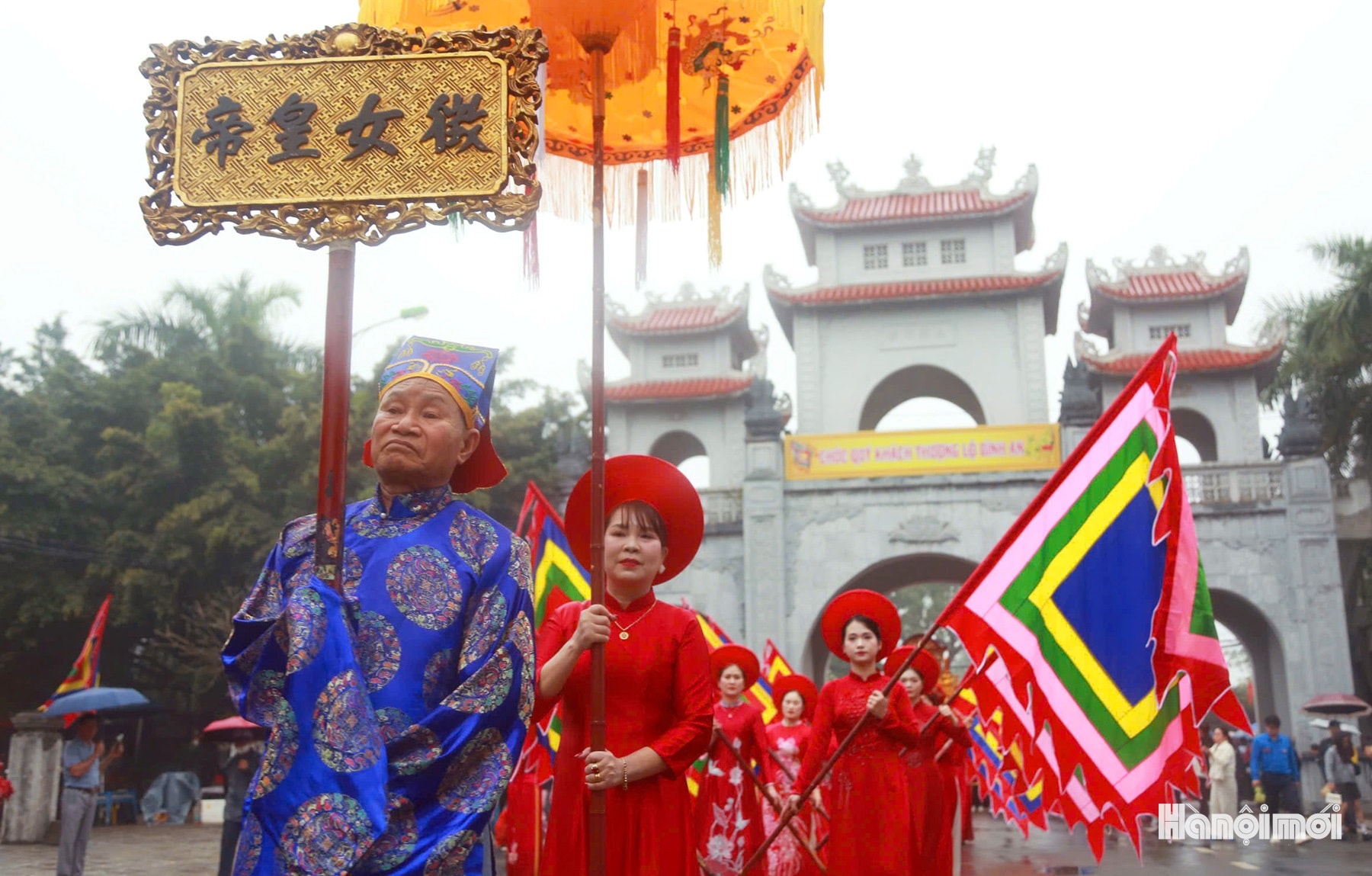 Ngay từ sớm, lễ rước kiệu từ đình Hạ Lôi về đền Hai Bà Trưng cùng các hoạt động tế lễ được thực hiện theo nghi thức truyền thống.