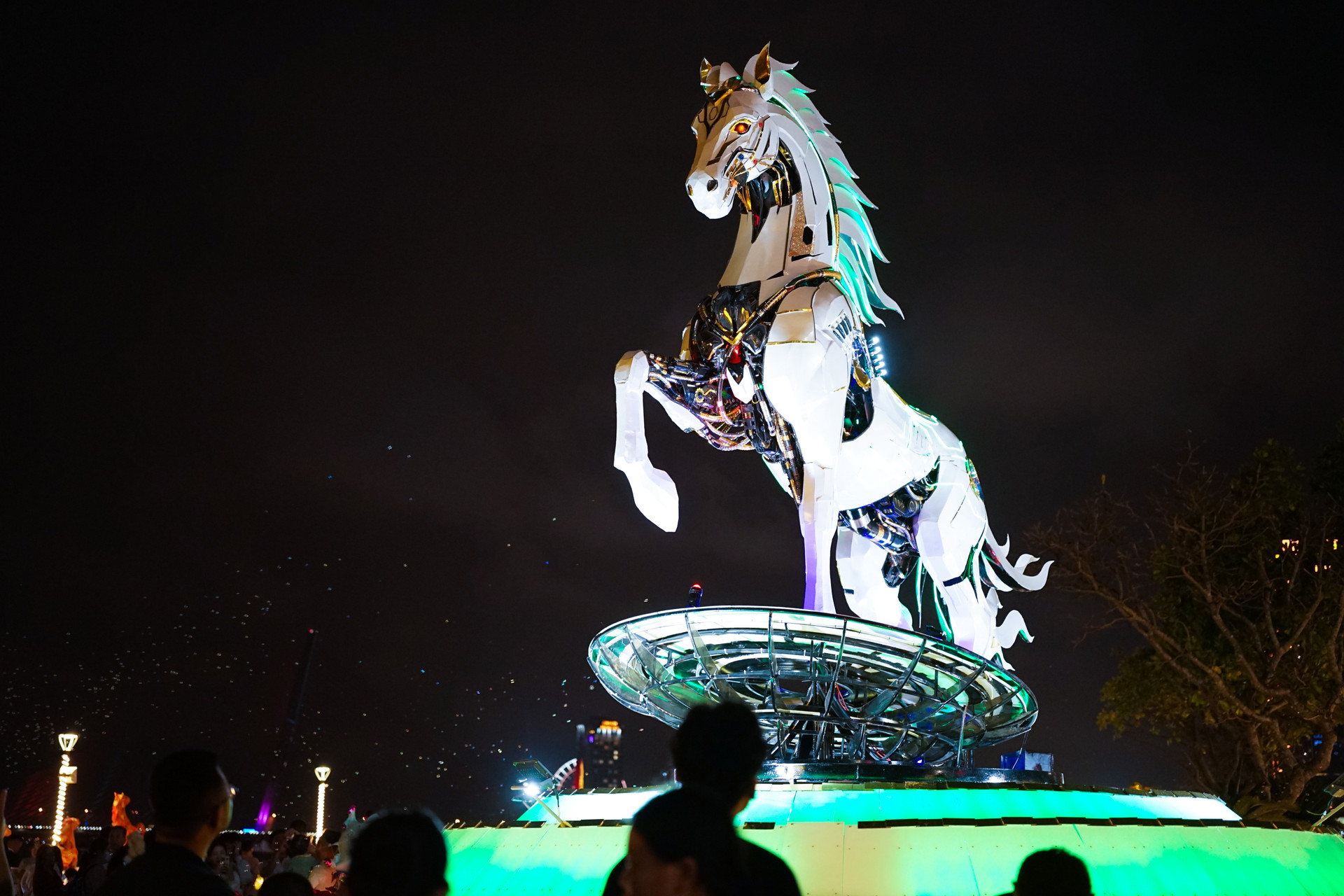 Bộ đôi linh vật ngựa “Kim Mã hợp nhất” và “Kim Mã 4.0” là điểm nhấn trang trí cảnh quan Tết của Đà Nẵng năm nay. Ảnh: XUÂN