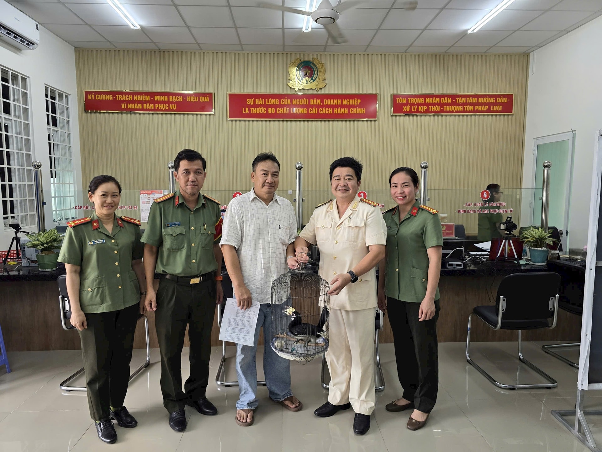 Trước đó, ông Phan Hoàng Thanh (sinh năm 1973, ngụ khu phố Hưng Thọ, phường Thuận An, thành phố Hồ Chí Minh) đã mang cá thể chim này đến trụ sở Công an phường để bàn giao cho cơ quan chức năng.