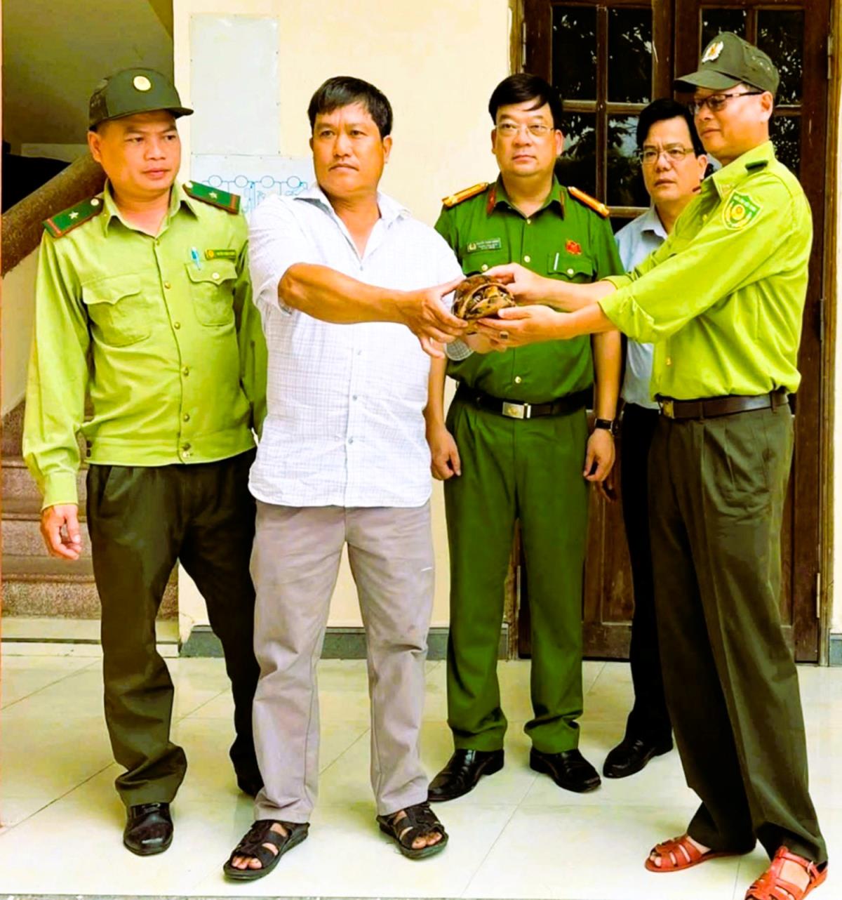 Trước đó, anh Trần Kim Hòa (1976, trú thôn Mỹ Phước, xã Vu Gia) phát hiện sau vườn nhà có 1 cá thể rùa nặng khoảng 1kg. Nghi vấn đây là cá thể rùa quý hiếm, anh Hòa đã giao nộp cho Công an xã Vu Gia.