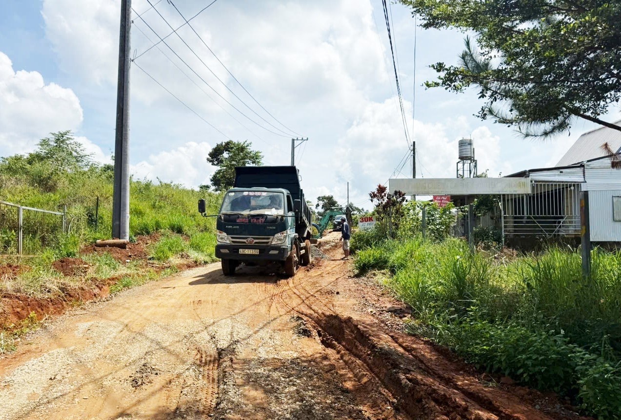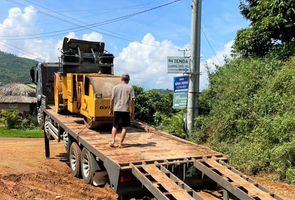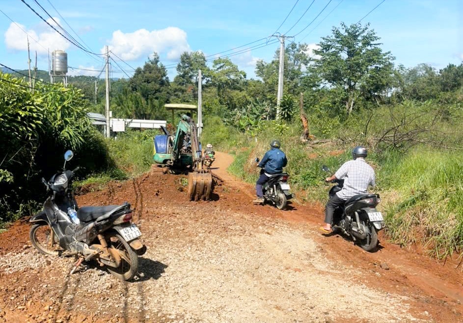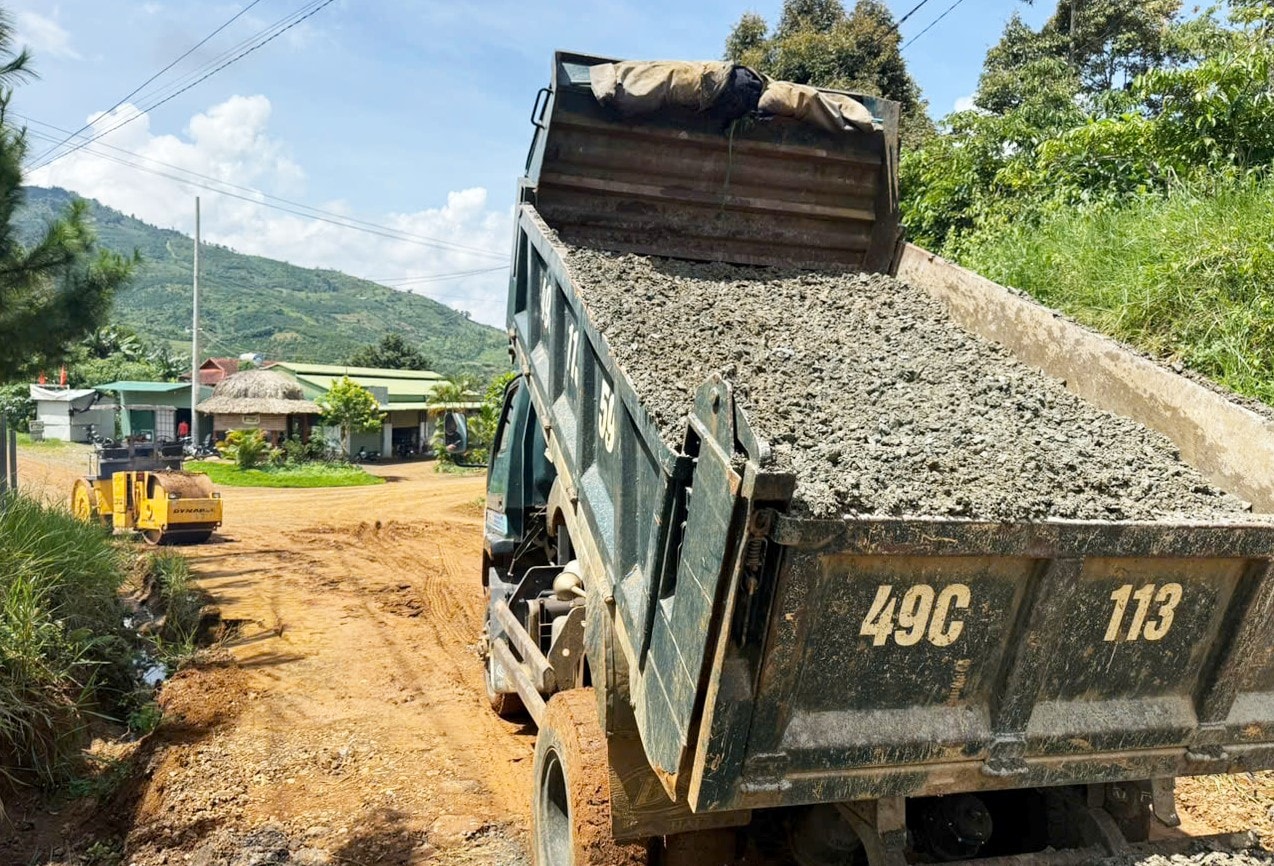 Sau khi san gạt, mặt đường sẽ được đổ đá cấp phối lu nén và rải nhựa tạt giúp người dân đi lại đảm bảo an toàn