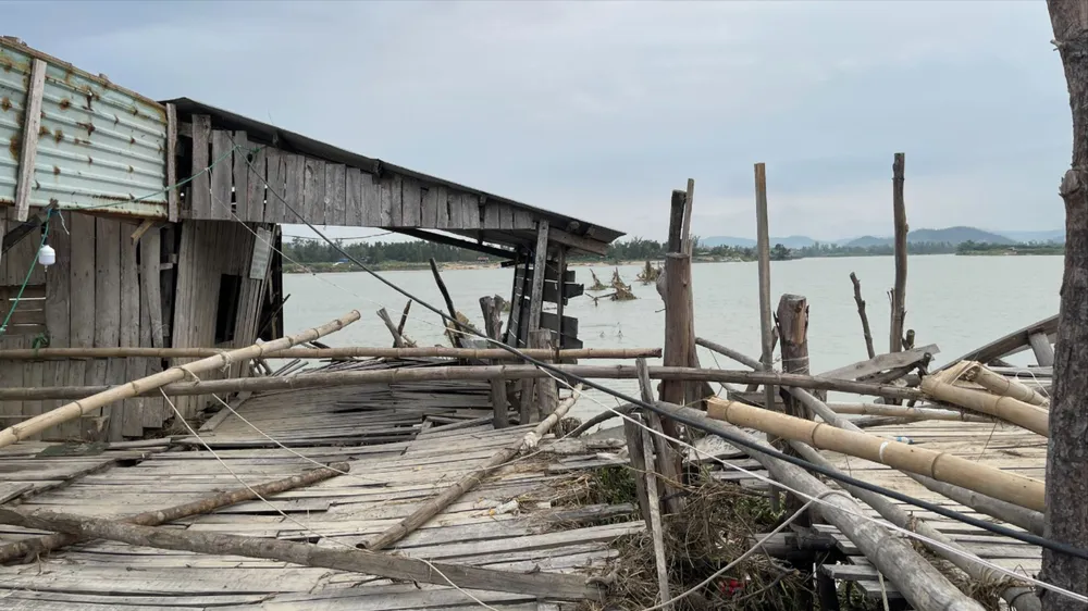 Tre, gỗ và nhà tạm gần cầu bị nước lũ phá hỏng. Ảnh: H.T