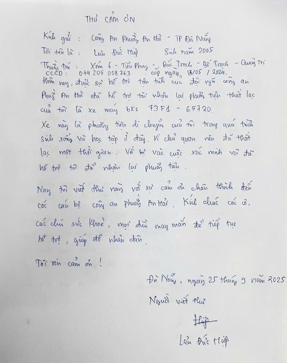 2 trong những lá thư cảm ơn cùng xe máy bị mất do sơ hở đã được CAP An Hải điều tra, thu hồi, trao trả cho người dân.