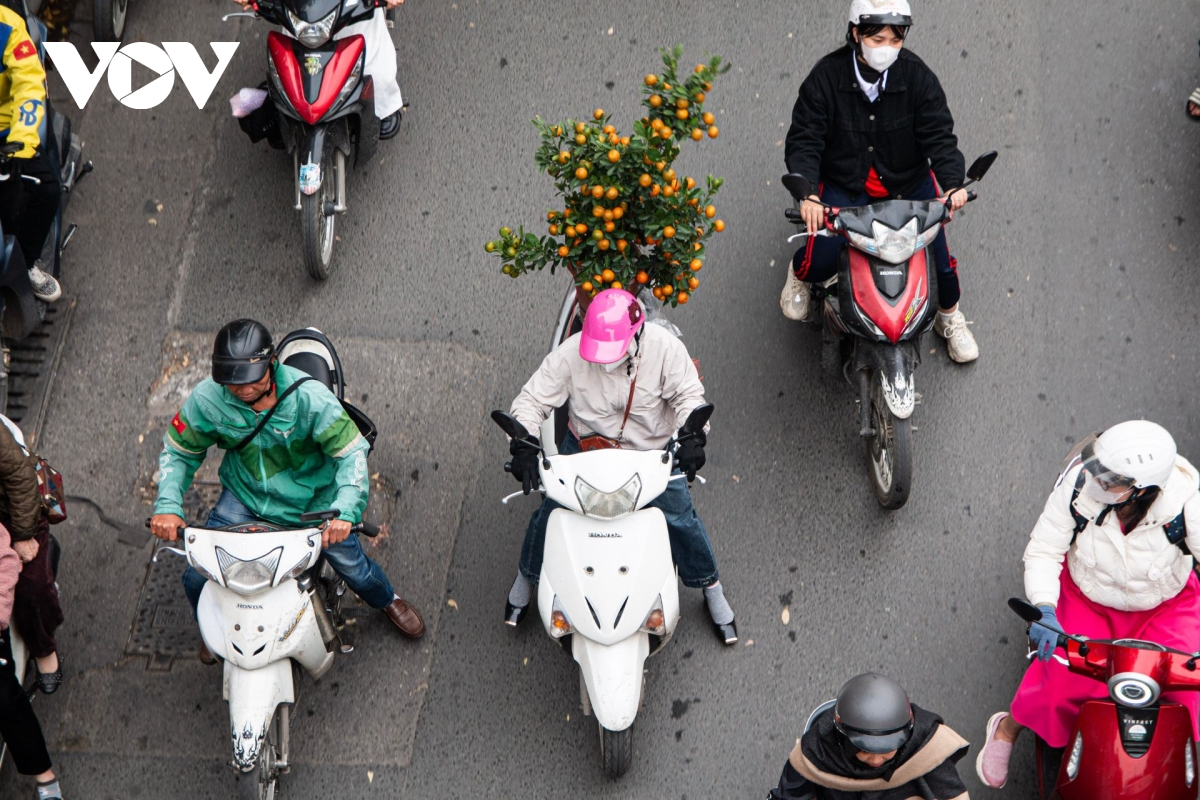 Những ngày cận Tết, người dân tranh thủ sắm quất về trang hoàng nhà cửa, song việc vận chuyển gặp không ít khó khăn, đặc biệt khi đường phố đông đúc, lưu lượng phương tiện tăng cao.