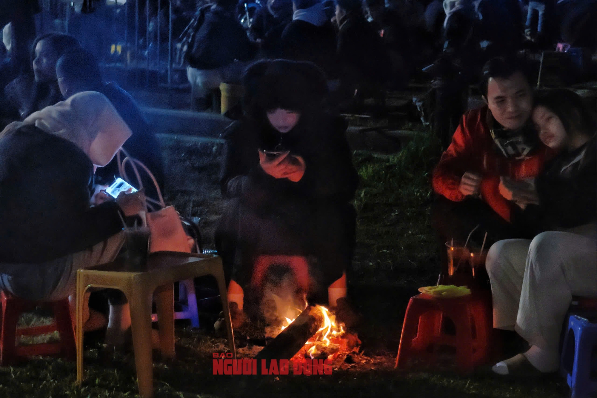 Đêm 6-1, tại khu vực hồ điều hòa Mai Dịch, phường Từ Liêm, Hà Nội, nhiều bạn trẻ ngồi uống nước phải quây quần bên đống lửa mới có thể chịu đựng được cái rét tê tái. Ảnh: Hải Anh