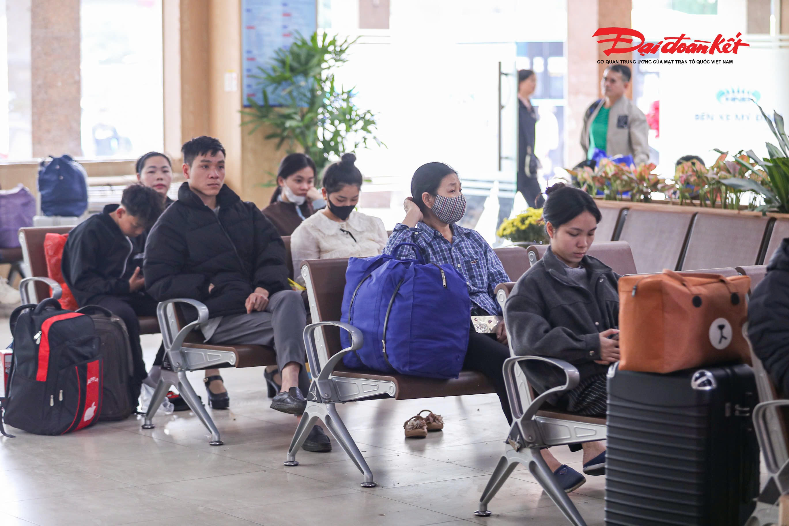 Hành khách thư thả ở khu vực sảnh bến xe Mỹ Đình chờ đến giờ lên xe về quê đón Tết.